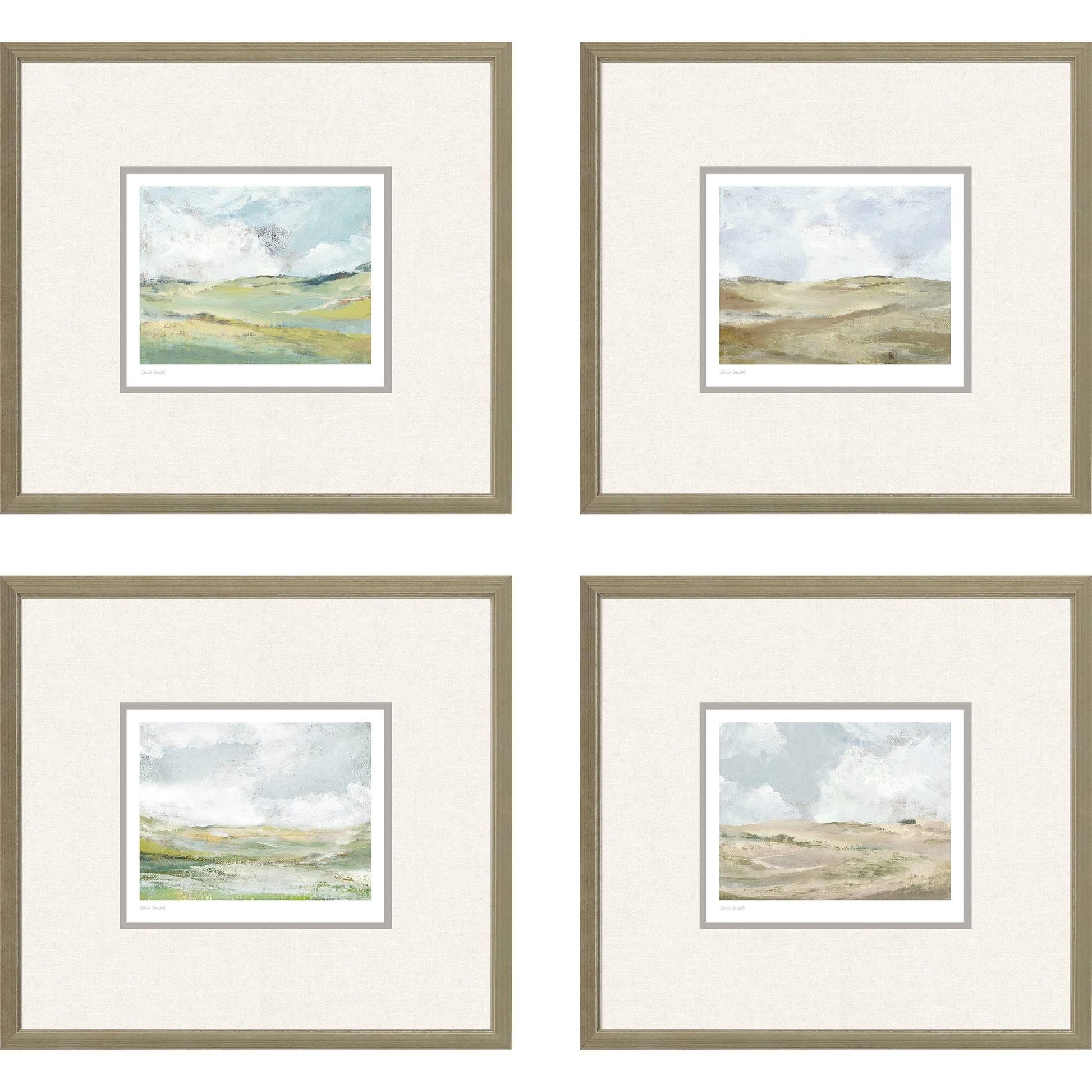 Transform any space with this set of four framed art pieces. Featuring serene countryside scenes, each piece is crafted on fine art paper. This set combines premium matting with sleek champagne gold wood frames, adding a touch of elegance to any room. The neutral tones of beige, white, green, and blue create a calming atmosphere that's perfect for any transitional style home. Each artwork is designed to bring a slice of the tranquil outdoors inside, enhancing your living space with its soothing palette.
