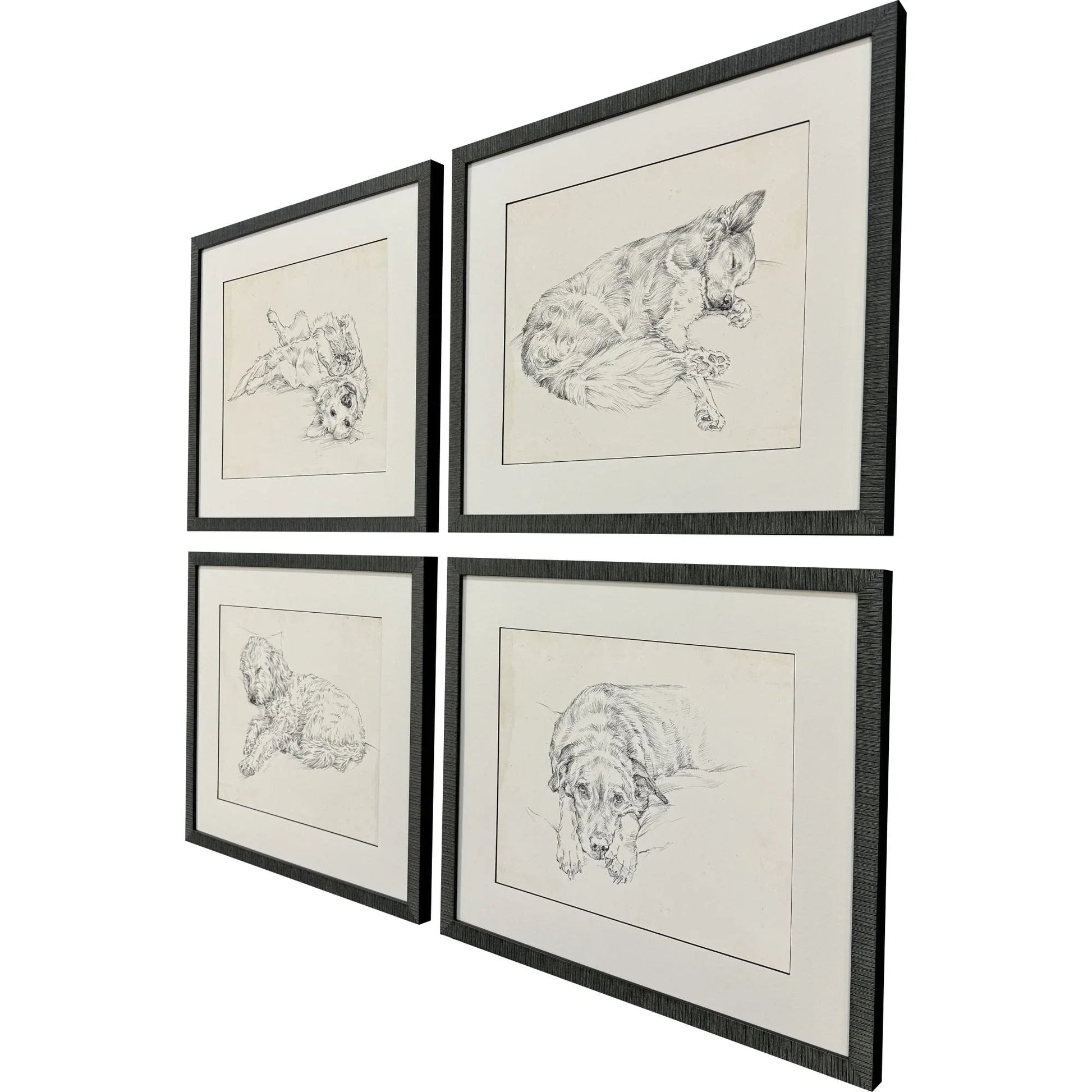 This collection of framed art brings a touch of vintage charm to any room. Featuring four delightful dog sketches, each piece showcases the timeless appeal of traditional art. These sketches capture the essence of dogs in relaxed poses, drawn in black ink on an off-white background. The minimalist style allows the viewer to appreciate the simple yet expressive lines that bring these lovable canine characters to life. The distressed black finish on the frame, enhanced with a subtle gray wash and black side, complements the overall look, making it suitable for any traditional or modern decor. This set is ideal for dog lovers looking to add a touch of nostalgia to their living space.