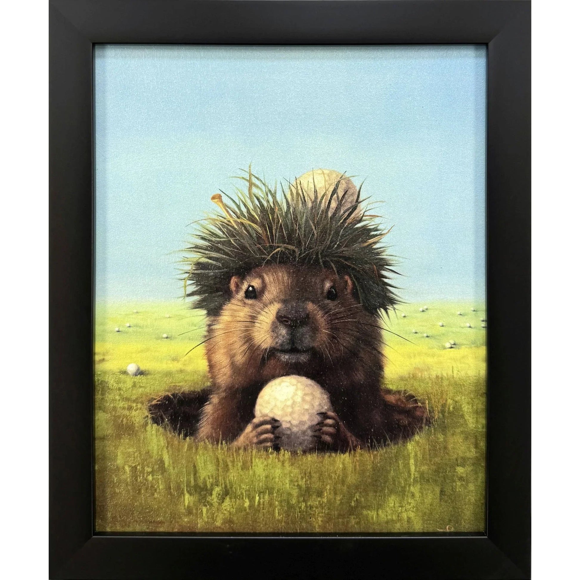 Add a playful touch to your space with this charming framed artwork featuring a groundhog sporting a grass hat and holding a golf ball. The scene captures a whimsical moment on a green field, with scattered golf balls against a blue sky. Expertly crafted, this piece is perfect for those who appreciate a hint of humor in their decor. The artwork's casual style ensures it fits effortlessly into any setting, whether it's a living room, office, or bedroom.