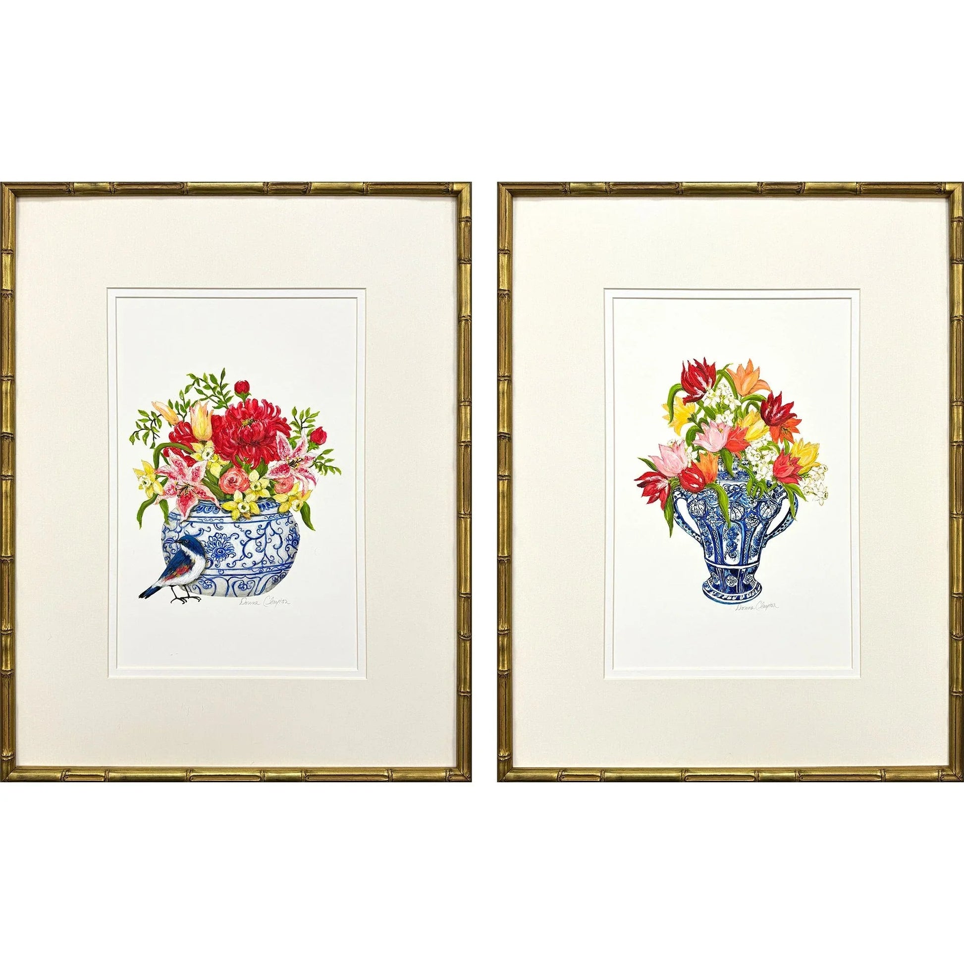 Inspired by timeless museum pieces, this exquisite artwork set brings elegance to any room. The Blue and White S/2 Exclusive Floral Artwork Set showcases bouquets adorned with hand-painted details, capturing the beauty of vibrant red, yellow, and pink flowers. A delicate bird illustration adds charm to the left print, enhancing its visual appeal. Each piece is framed in antique gold wood with bamboo embossing, giving it a traditional yet sophisticated look. The classic blue ceramic vases complement the floral arrangements, creating a harmonious balance of color and design.