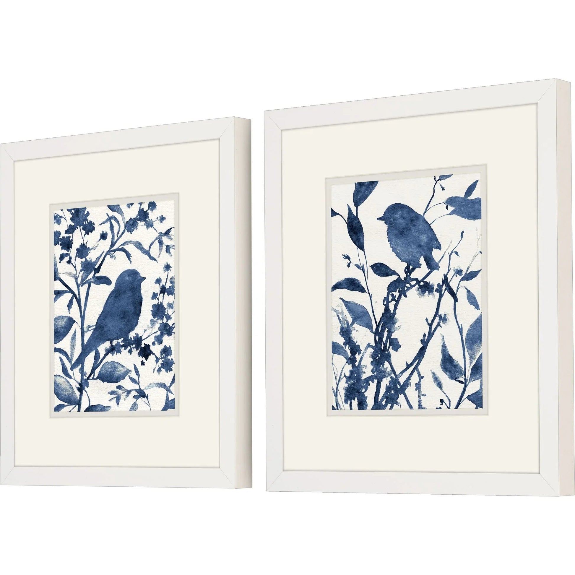 Crafted with care, this art set is hand assembled using quality materials, including paper, cardboard, extruded poly, and glass. The glass front not only protects the artwork but also adds a sleek finish, enhancing the vivid blue tones of the bird silhouettes against the floral backdrop. With its rectangular shape and thoughtful craftsmanship, this set of two framed prints offers a tasteful blend of simplicity and elegance.