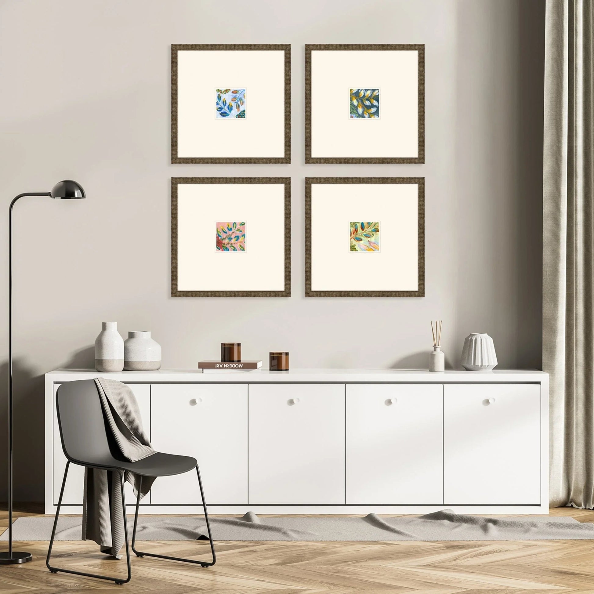 Enhance your living space with this stunning collection of four botanical prints. Each artwork in this series adds a touch of nature's beauty to any room. The vivid colors of orange, blue, green, and yellow bring life to these abstract leaf designs. These pieces are set against extra-wide white matting, allowing each color to pop brilliantly. The ribbed moulding of the frames has a distressed antique gold finish, giving a touch of elegance and sophistication to your walls. This collection offers a unique way to enjoy the beauty of nature indoors.