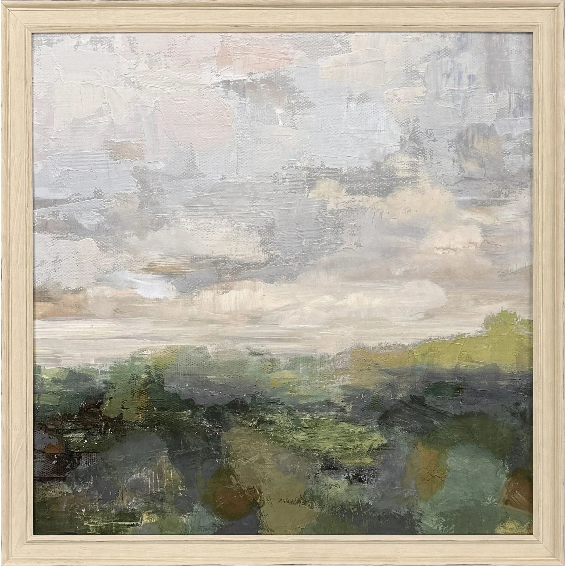 Embrace the tranquility of nature with the Calm Reflection II Framed Art With Glass Front. This piece features an abstract landscape, beautifully designed in shades of green and gray, evoking a serene and peaceful atmosphere. The textured brushstrokes and muted color palette create a captivating visual experience, inviting viewers to pause and reflect. The landscape, with its earthy tones and gray sky, offers a soothing escape from the everyday hustle, making it a perfect addition to your living space.
