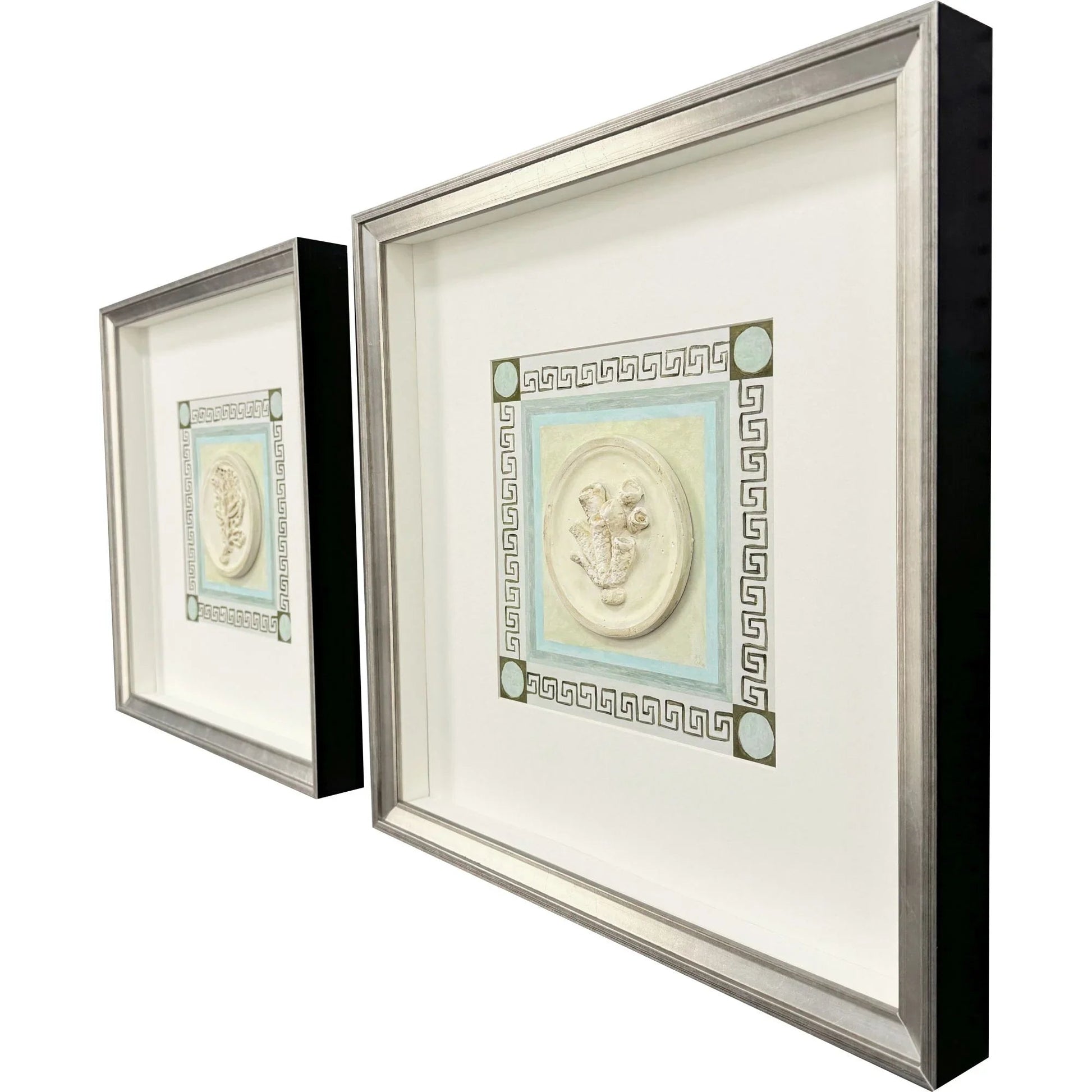 Each piece in this set of two framed art prints is crafted with care, using a mix of paper, cardboard, plaster, wood, and glass. The hand-finished touch ensures that every detail is meticulously presented, while the glass front offers protection and a clear view of the intricate designs. Measuring just right to fit various spaces, this art set is not just a decoration but a statement of style and exclusivity. Whether placed in a living room, hallway, or office, it enhances the ambiance with its classic decorative appeal.