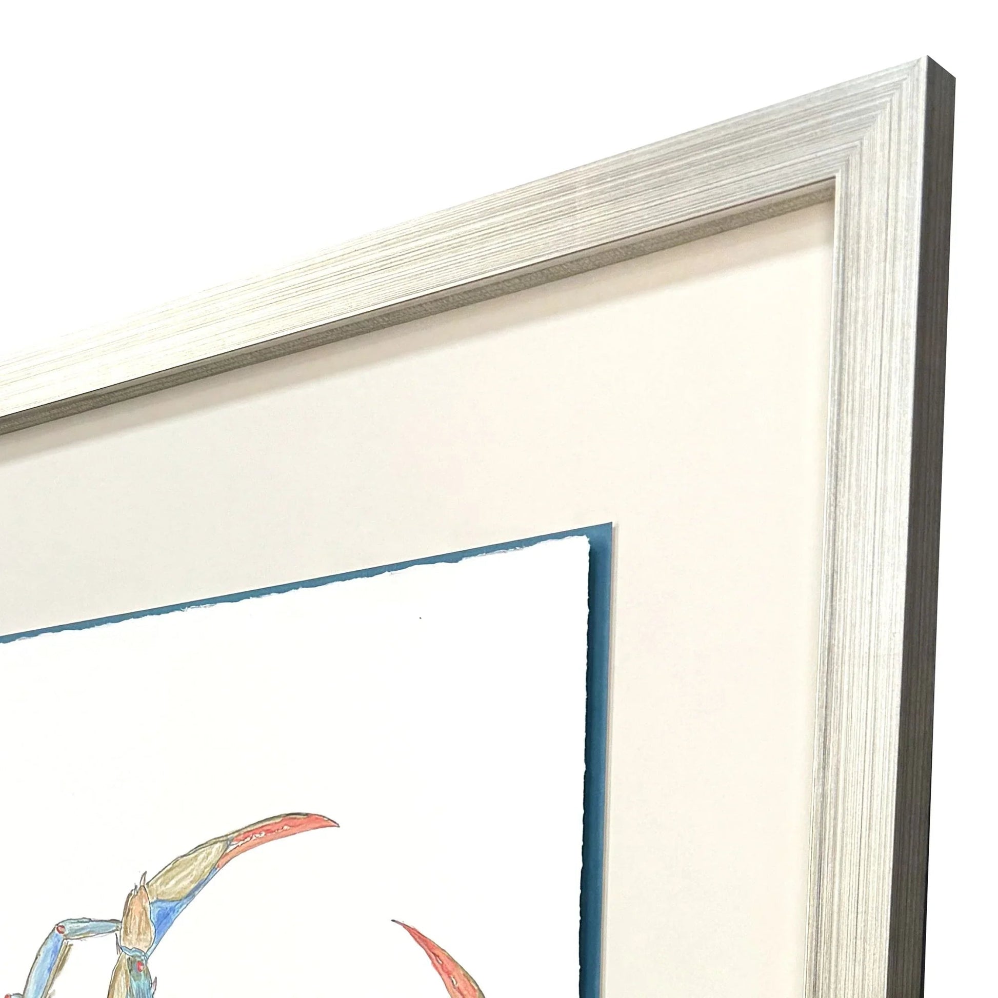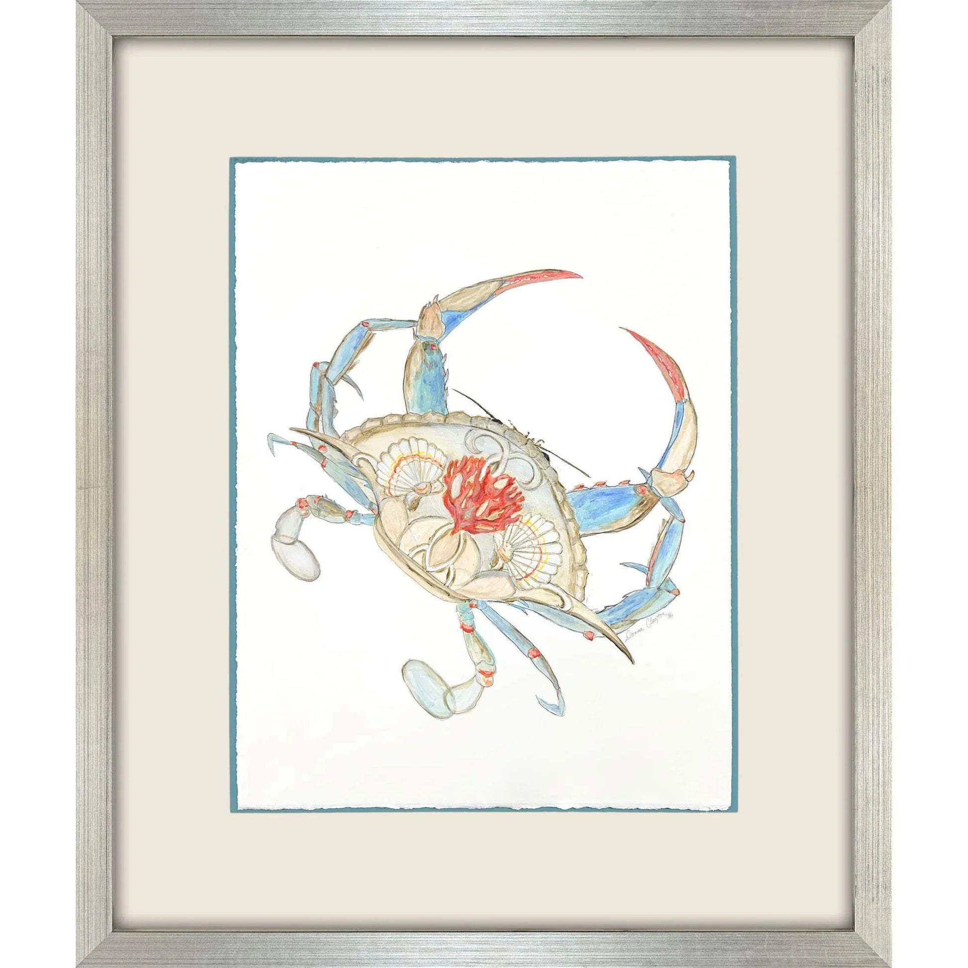 Bring a touch of coastal charm to your home with this stunning piece of art. Crafted as a giclee on fine art paper, this artwork showcases a beautiful crab illustration in vibrant blue, red, and beige tones against a soothing cream background. The unique watercolor style brings a sense of calm and tranquility, making it a perfect addition to any modern coastal decor. This artwork is float mounted with buff matting and further enhanced by a shadow box effect, adding depth and dimension to your space.