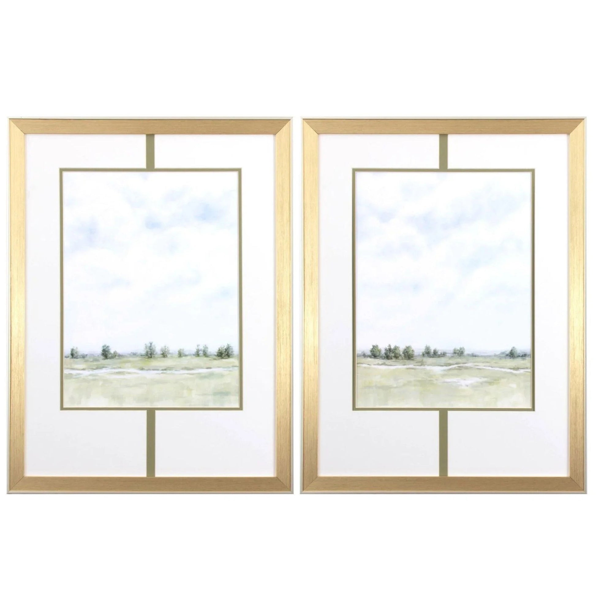 Enhance your living space with a touch of elegance through this exquisite set of two gold-framed landscape artworks. These pieces offer a calming view with soft hues of green, blue, and white, making them a perfect addition to any room. Each artwork is framed in a modern gold finish moulding, complemented by a champagne side and lip, offering a refined touch that suits any transitional style decor. The images are offset with white matting that features a precise channel cut, adding depth and sophistication to the overall presentation.
