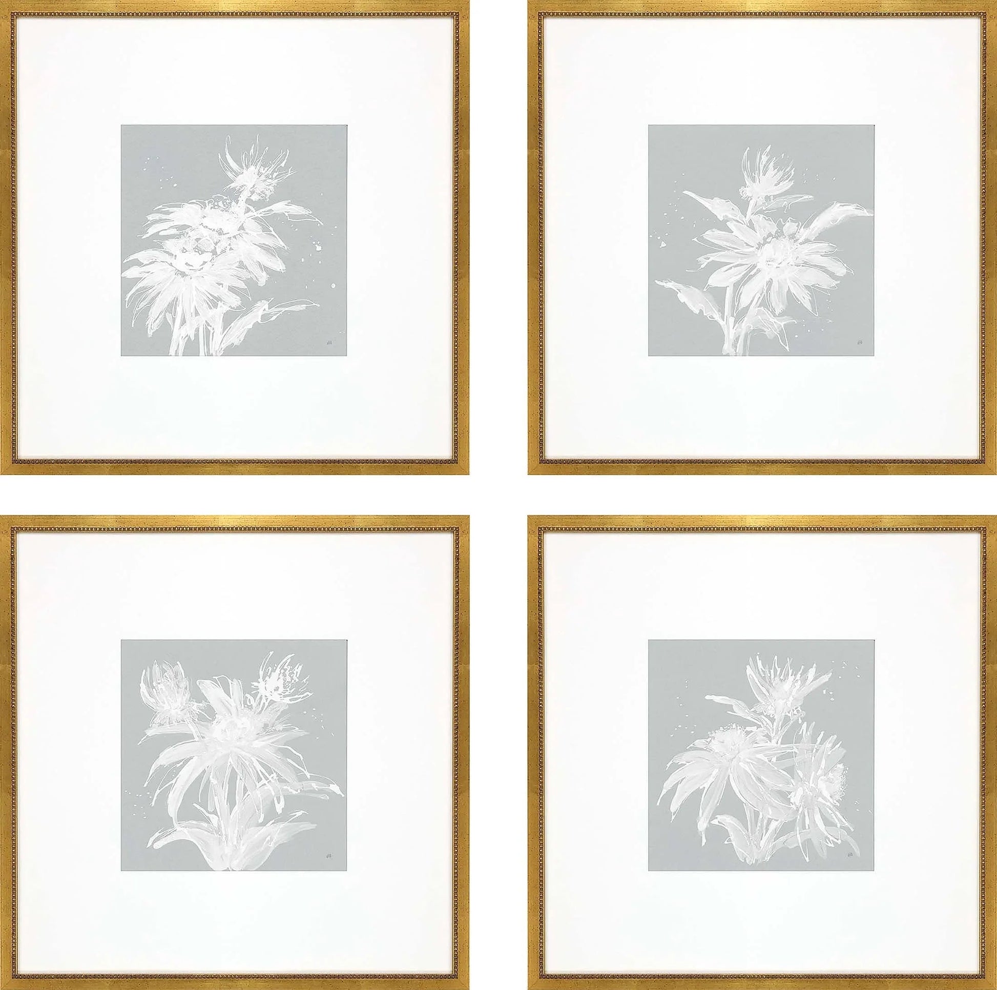 Enhance your living space with a touch of elegance through this set of four botanical art pieces. Each artwork features blue and white flower silhouettes, elegantly matted in white. The traditional antique gold frames with a beaded lip add a classic touch, making them a beautiful addition to any room. These pieces are designed to complement a variety of home decor styles, providing a timeless look that can easily blend into both modern and traditional settings.
