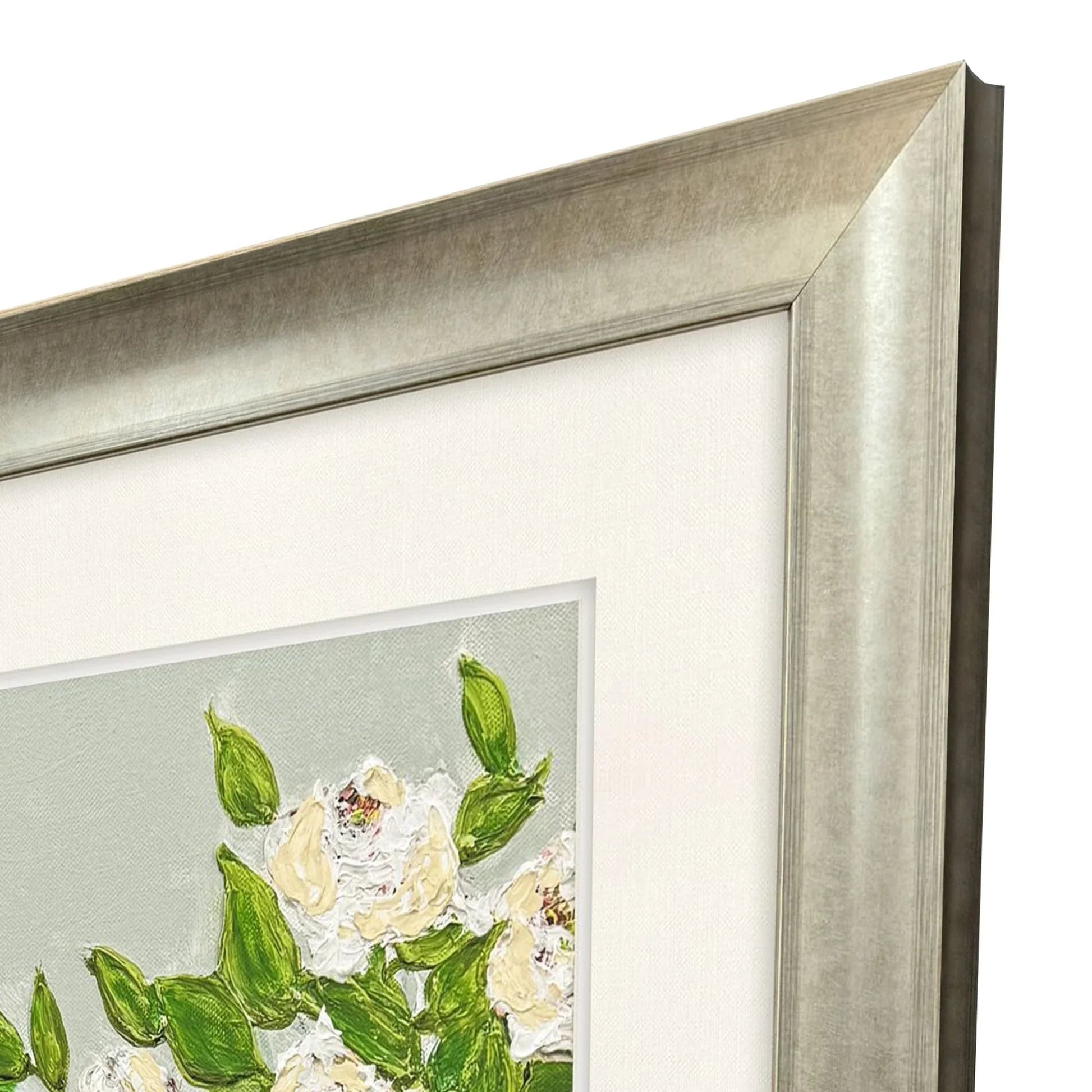 A stunning piece of art that captures the elegance of nature, this hand-finished art piece brings a touch of sophistication to any room. Featuring a jubilant floral arrangement, the artwork showcases white flowers and green leaves in a blue-and-white patterned vase. The exquisite hand-painted touches add depth and dimension, enhancing the visual appeal. The premium linen-look mat offers a raised texture that complements the detailed artistry, making this piece a true standout.