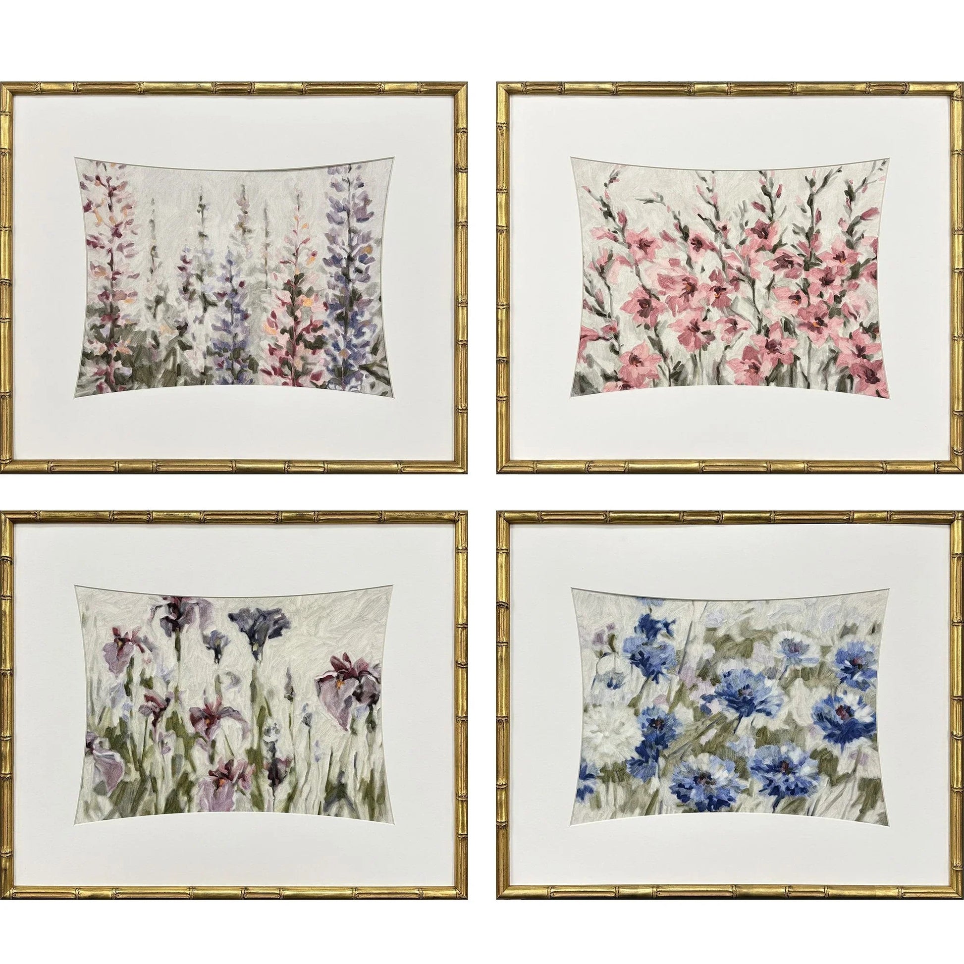 Brighten up any space with this charming set of four botanical art pieces. Each piece features a delightful floral arrangement that captures the essence of a serene garden. The use of specialty cut white matting adds a touch of farmhouse style, making it a perfect addition to both modern and traditional interiors. The combination of pink, purple, blue, and green hues brings a refreshing splash of color, enhancing the overall appeal of your room.