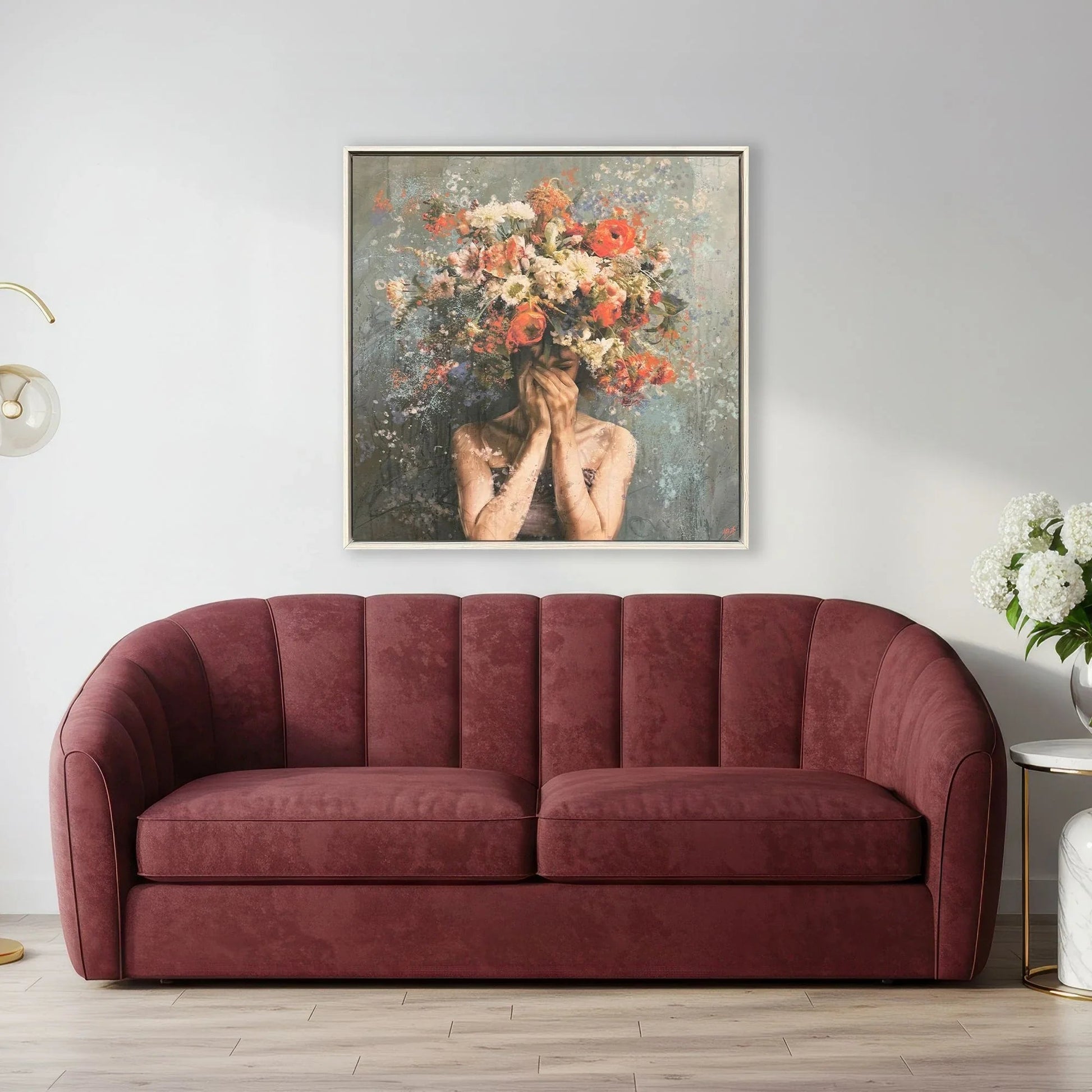 Immerse yourself in a world of vibrant colors with this captivating floral artwork. A cascade of flowers gracefully envelops a young woman's face, presenting a striking blend of nature and human beauty. Each element of this art piece is thoughtfully crafted, capturing the essence of contemporary style. The artwork is mounted within a painted whitewash wood floater frame that adds an elegant touch without overpowering the vivid scene. This piece is perfect for adding a splash of color and sophistication to any room.