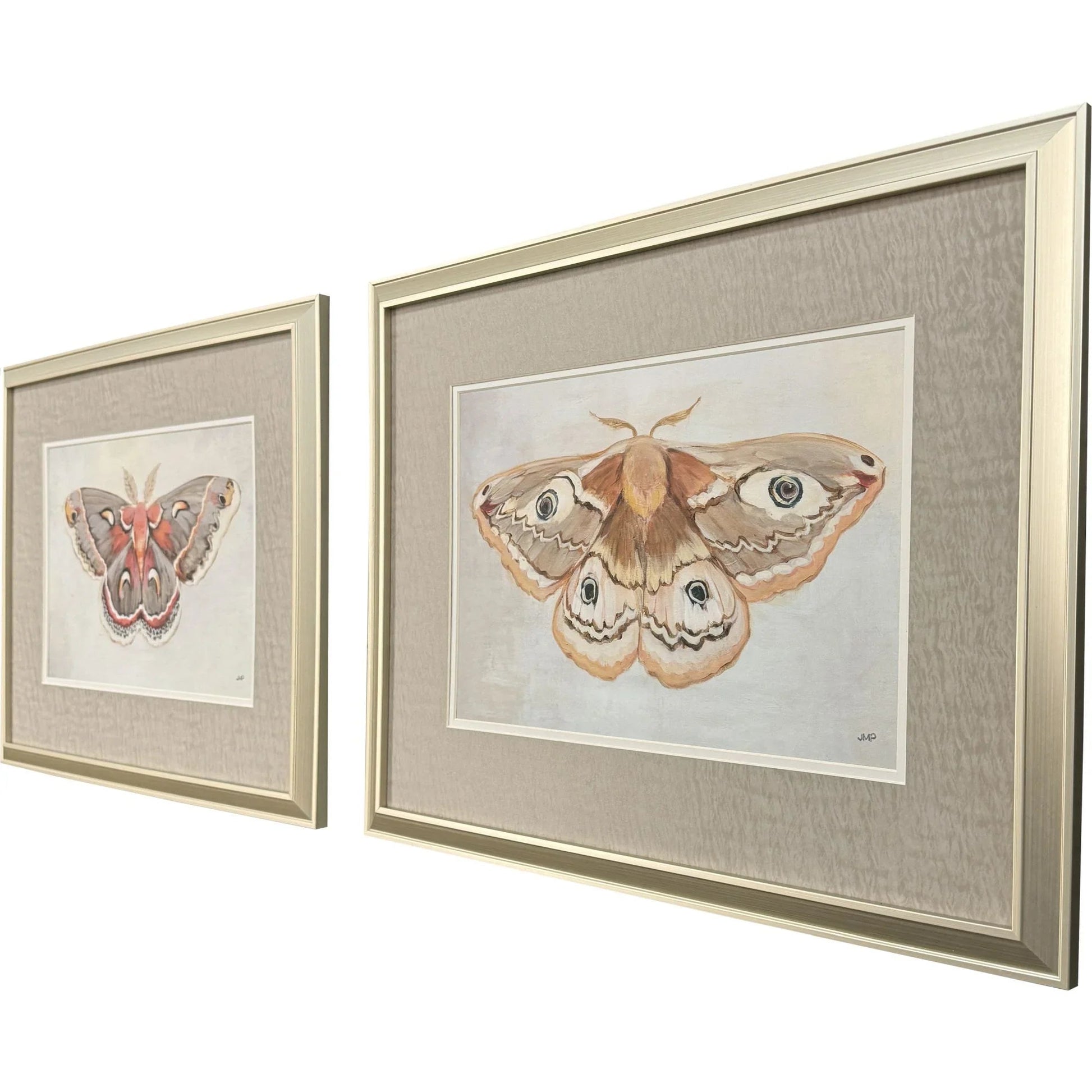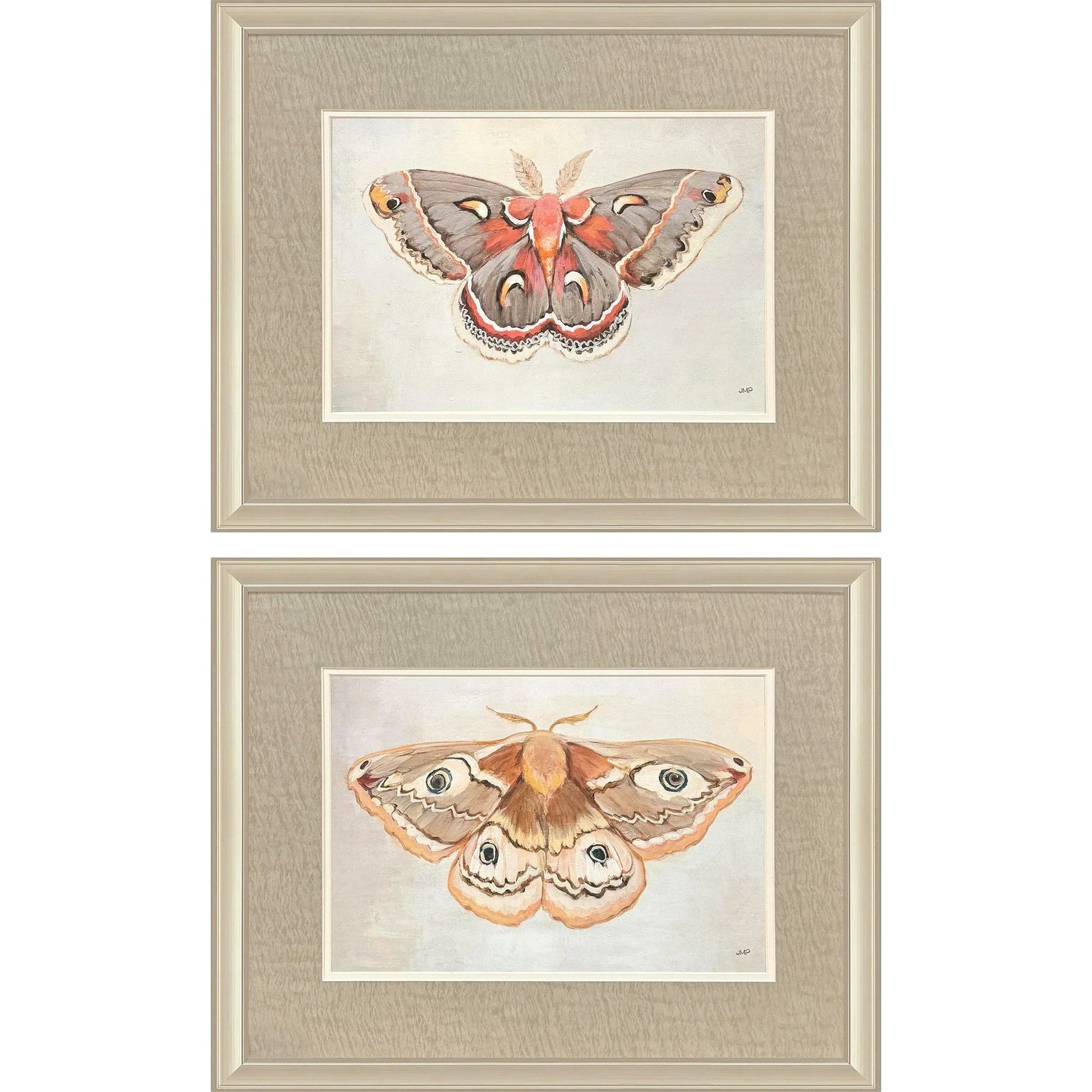 Enrich any space with the Forest Moth S/2 Framed Art With Glass Front. This set features two captivating moth studies, each beautifully matted with a premium top mat. The intricate details of the moths are highlighted against soft backgrounds, creating a serene and appealing visual experience. Framed in a champagne gold finish moulding, this artwork adds a touch of luxury and sophistication to any room. The transitional style complements both classic and contemporary interiors, making it a versatile choice for various decors.
