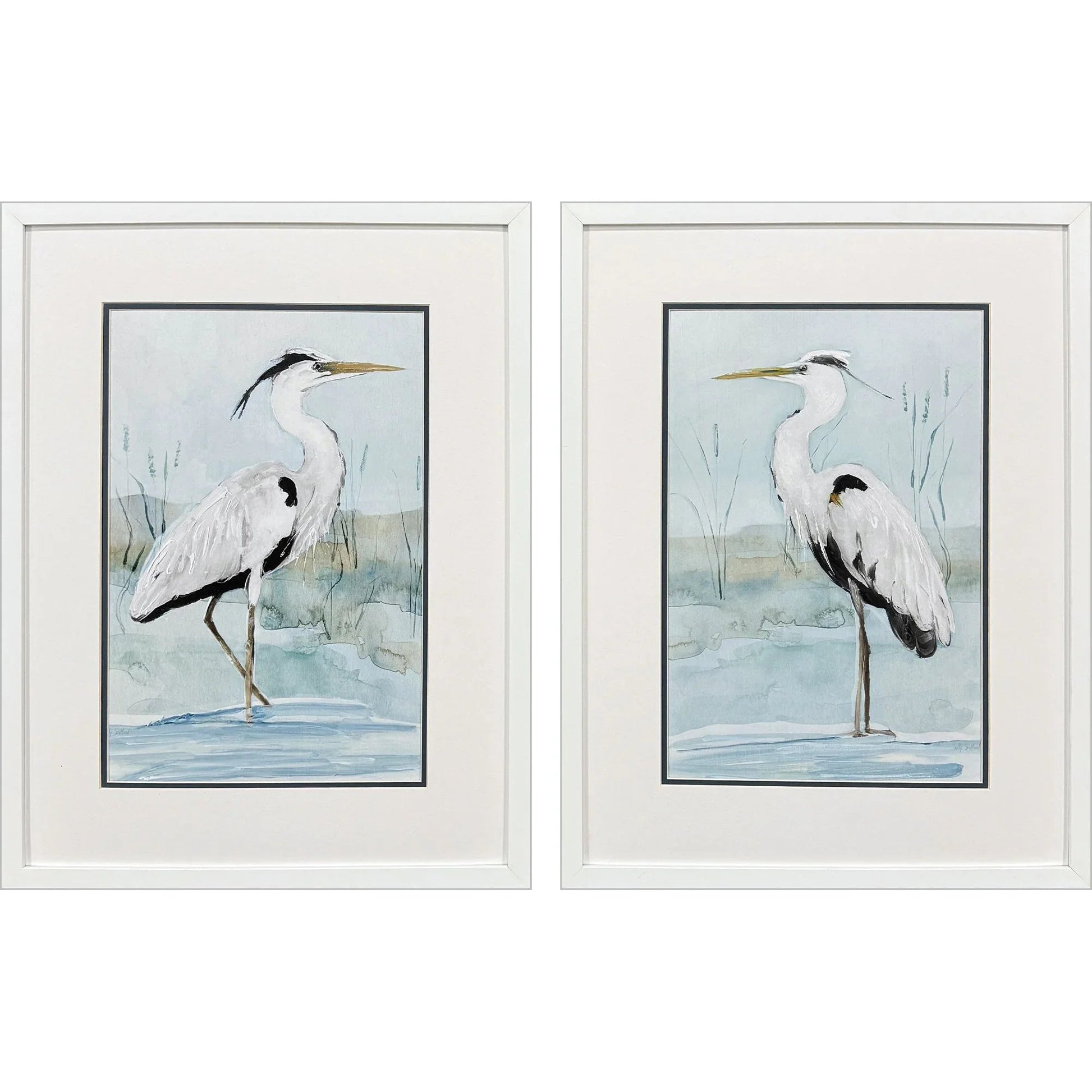 Transform your living space with the tranquil charm of the Heron On Blue S/2 Coastal Matted Glass Artwork. This set features exquisite heron prints, beautifully double matted in white and ocean blue, offering a serene coastal vibe to any room. Each piece is housed in a modern flat profile moulding, finished in a matte white that complements the artwork's soothing blue and gray tones. The watercolor paintings depict two graceful herons standing in water against a light background, evoking a sense of calm and elegance.
