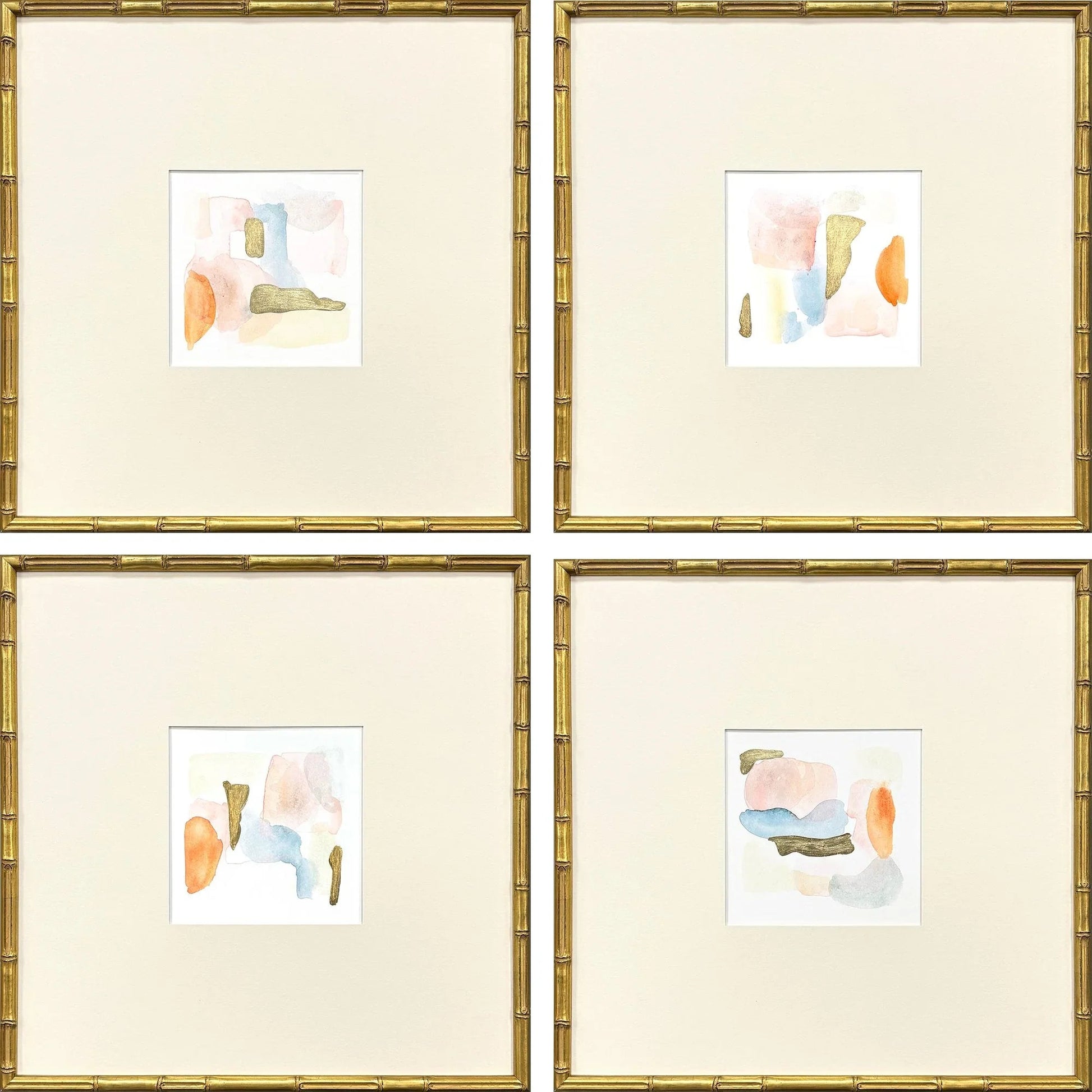 Bring a touch of elegance to your space with the Like Clouds S/4 Abstract Art Set. Each piece in this set of four features soft pastel colors, including blue, pink, and green, accentuated by hints of orange. These abstract watercolor artworks are designed to add a contemporary touch to any room. The minimal shapes are complemented by a square cream matte, creating a sophisticated look that seamlessly blends with various décor styles. The gold bamboo-style frame adds a touch of luxury, making these pieces perfect for both modern and classic interiors.