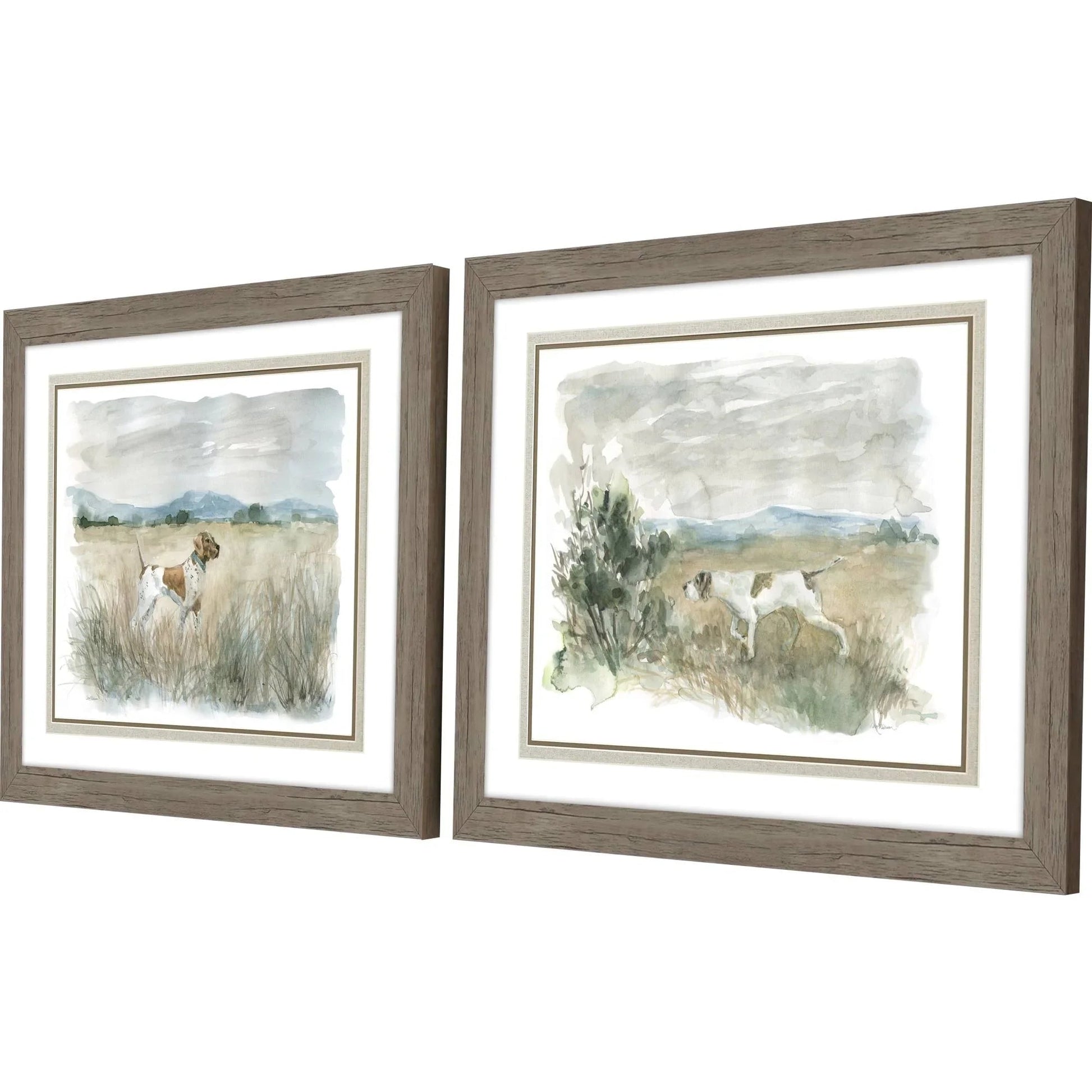 These hunting dog prints bring a touch of the great outdoors to your space, making them a perfect addition for a lodge retreat or any room that celebrates nature. The set includes two framed watercolor prints featuring hunting dogs set against a backdrop of fields and mountains. The soft tones of browns, greens, and grays blend harmoniously to create a peaceful and inviting atmosphere. Each print is matted in white, offering a clean and crisp contrast to the art itself, and is enclosed in a block profile moulding with a distressed wood finish to enhance the rustic charm.
