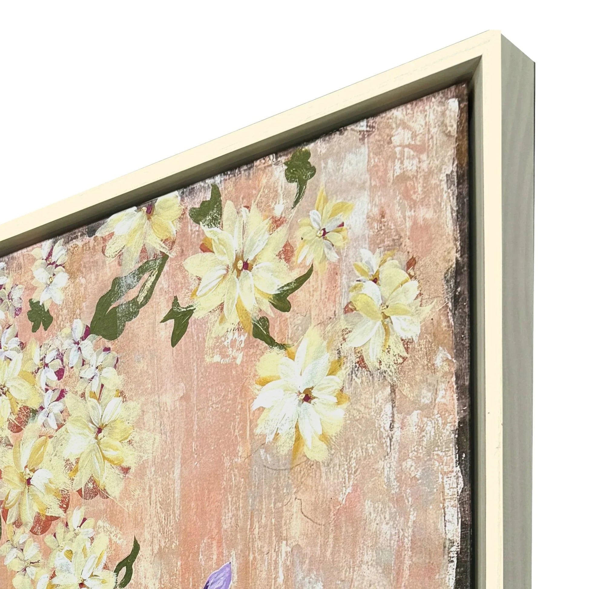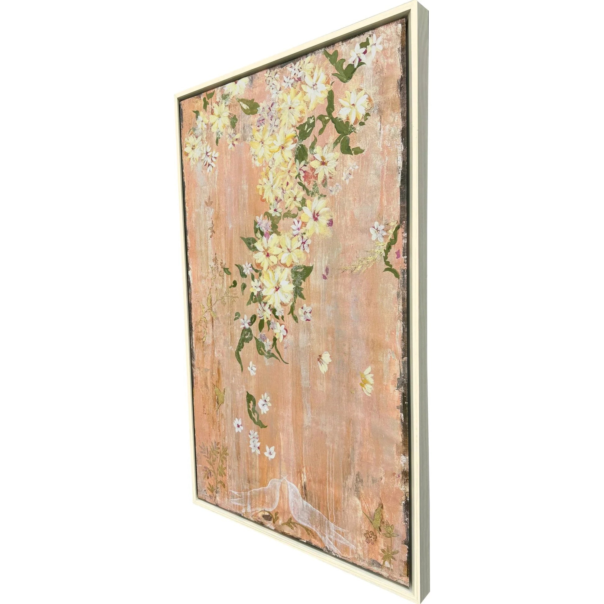 Transform your living space with the Love Birds I Exclusive Hand Finished Canvas Art. This exquisite piece captures the delicate beauty of nature, featuring a pastel peach background adorned with white and yellow flowers, green leaves, and a striking purple hummingbird. Each canvas is hand embellished, highlighting the intricate details of the flowers with a touch of gold leaf, bringing a touch of elegance and warmth to any room.