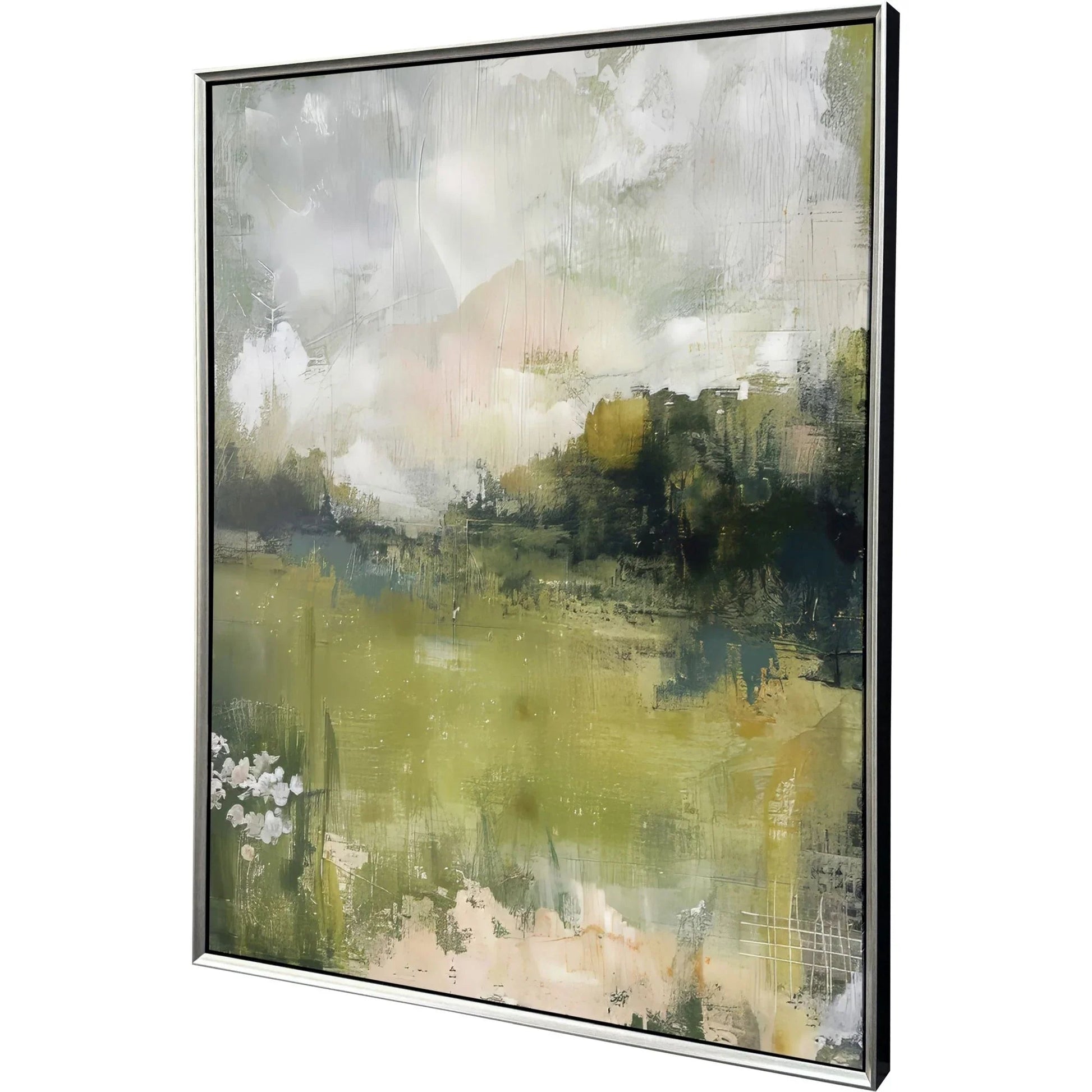 Mounted in a warm silver floater frame with satin black sides, this artwork stands as a statement piece in any room. Its transitional style seamlessly bridges traditional and modern aesthetics, making it suitable for numerous settings. The rectangular frame, devoid of glass, enhances the painting's depth without distractions. Hand-assembled, it reflects the careful attention to detail and craftsmanship that ensures lasting quality and appeal. This piece not only adds visual interest but also enriches the ambiance with its calming presence.