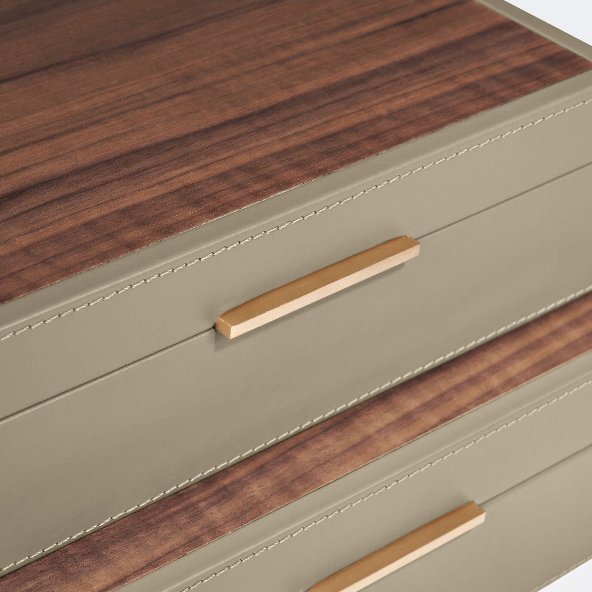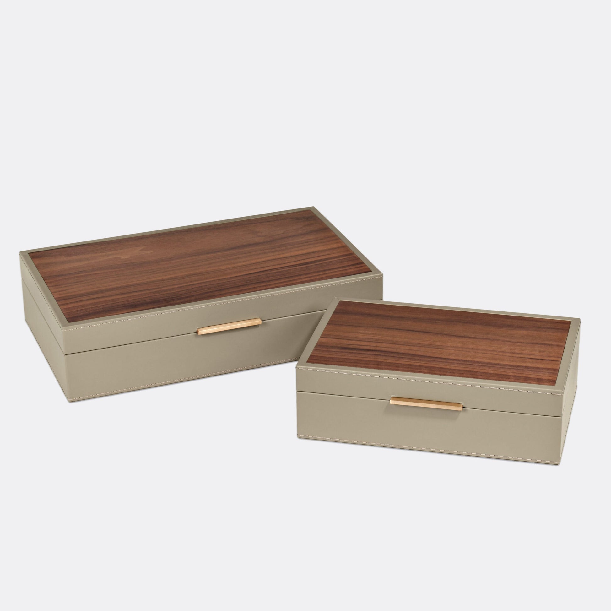 The Macy Boxes offer a perfect blend of elegance and functionality. Made from top-grain leather in gentle Beige-Olive color, these boxes feature natural walnut wood tops, bringing a touch of sophistication to any room. The refined brass hardware adds a subtle shine, enhancing their overall appeal. With a clean and stylish design, these boxes provide not just storage but also a touch of luxury. Their impeccable craftsmanship makes them a great addition to any space, whether you use them for storing your precious items or simply as a decorative piece. Elevate your home decor with these sophisticated and practical boxes.