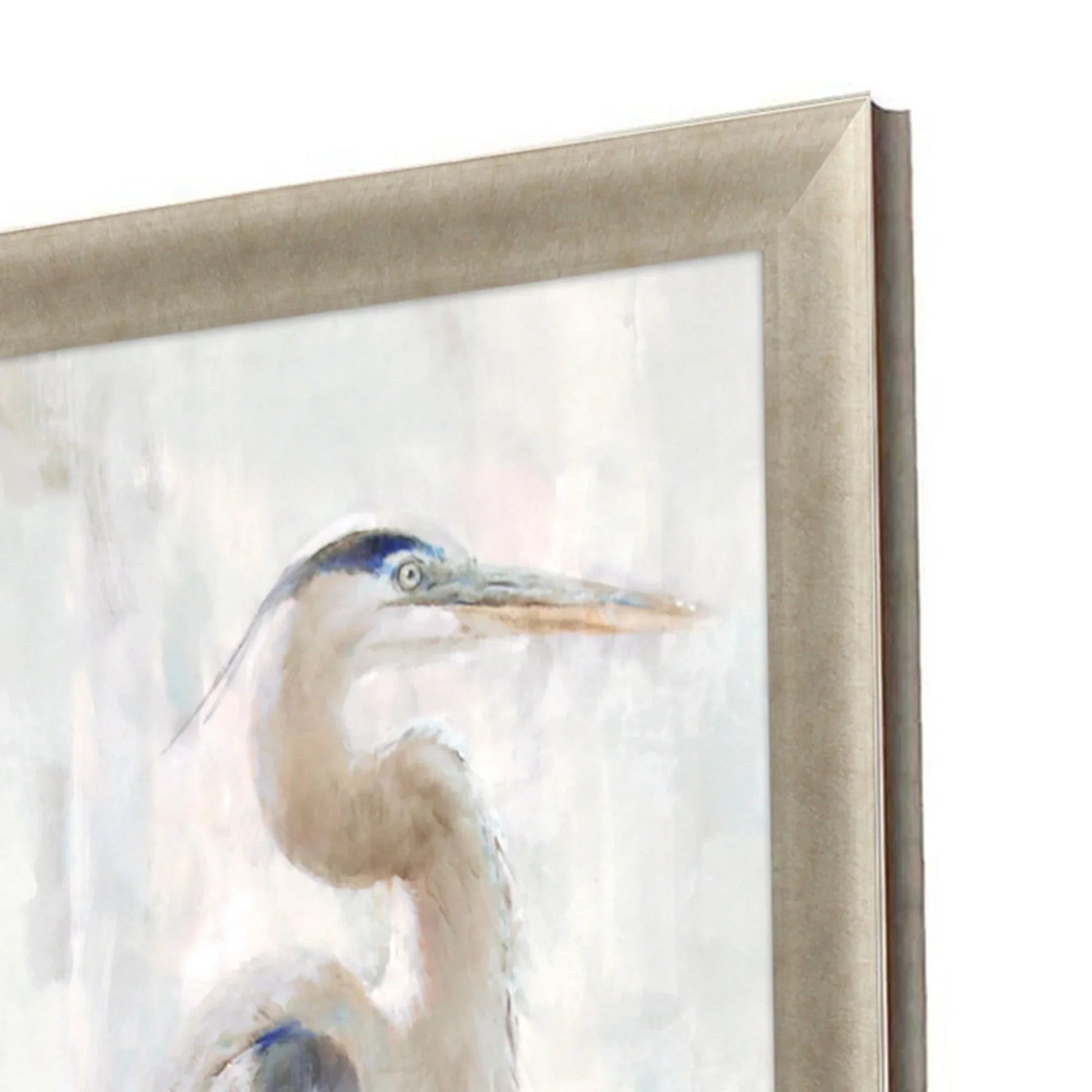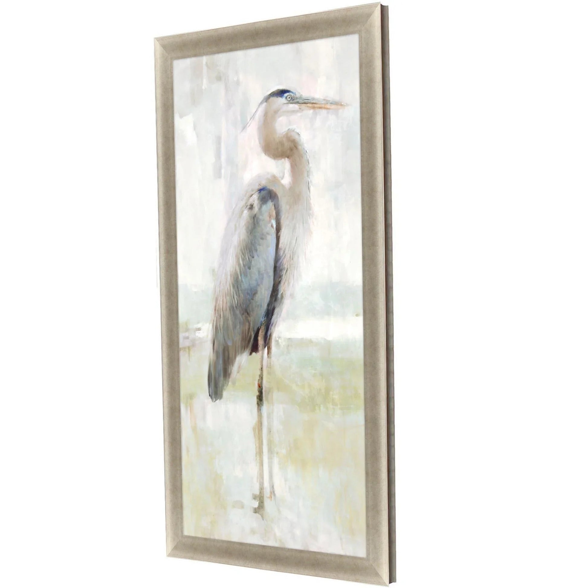 Transform any space into a serene coastal retreat with this stunning piece of art. This traditionally styled artwork features a graceful heron, known for its elegance and poise, captured in soft tones with blue-gray feathers. The heron stands against a calming beige and light green backdrop, creating a soothing atmosphere in any room. The vertical orientation and neutral frame with a warm silver finish make it a versatile piece that complements various decor styles.