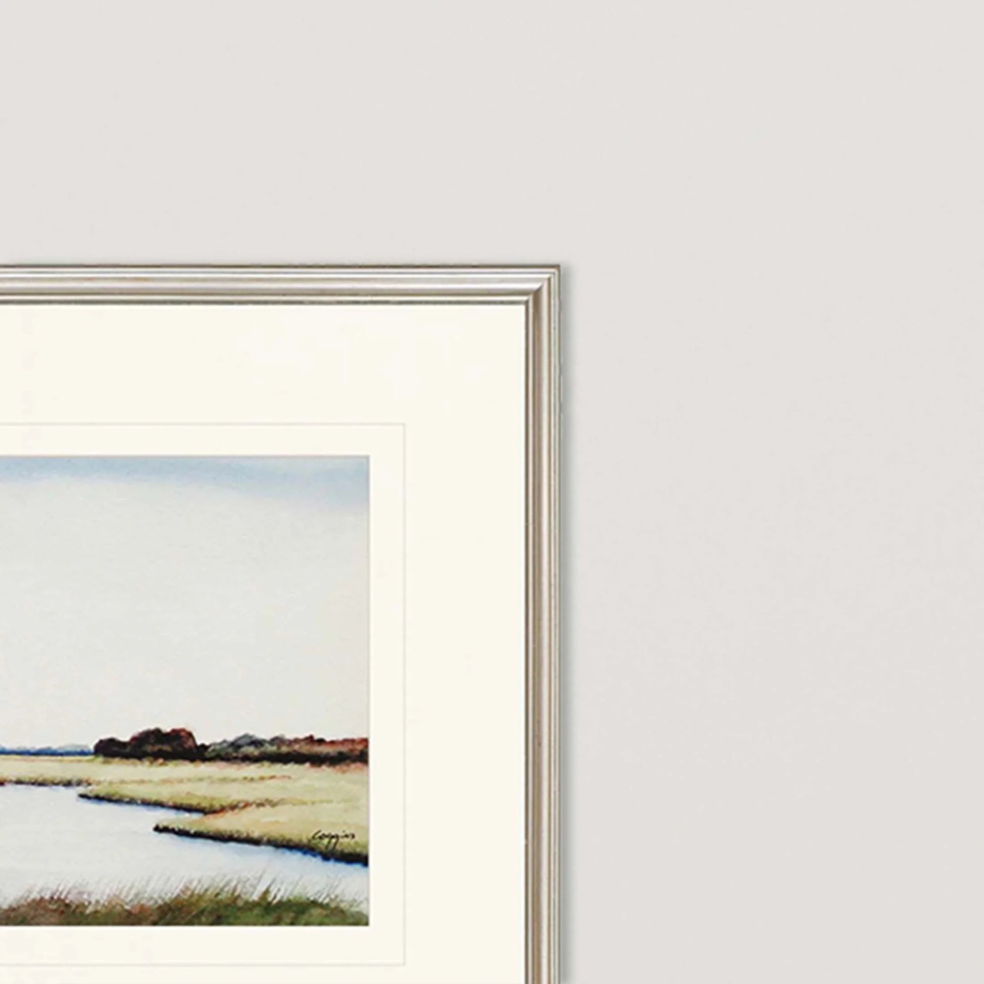 Bring the serene beauty of coastal landscapes into your home with this set of two Marshlands I Coastal Giclee Prints. These prints create a relaxing atmosphere, inviting you to unwind and enjoy the tranquil view of marsh scenes. Soft earth tones, including greens, blues, and browns, blend seamlessly with various decor styles. Each piece is double matted in white and framed in a classic metallic silver wood moulding, adding a touch of elegance to any room. The horizontal alignment of these prints enhances their calming effect, making them an ideal addition to your living room, bedroom, or office space.