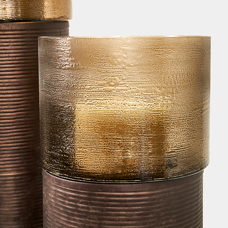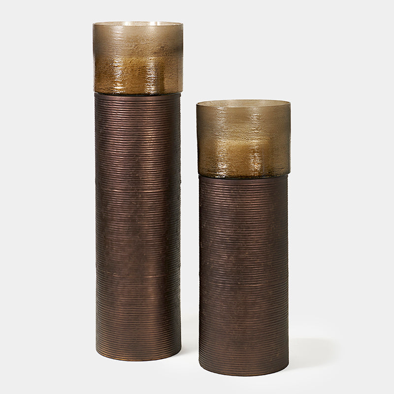 Illuminate any room with the Milo Candlestands, a pair of large candleholders that blend modern style and timeless elegance. Each piece features a handcrafted iron base in a rich aged brass finish, topped with textured glass hurricanes in a warm molten caramel color. Standing tall, these candlestands offer a sophisticated ambiance, perfect for enhancing any space. Their impressive height and sleek design make them an eye-catching addition to any decor, ideal for those who appreciate both function and style. Whether used for special occasions or everyday elegance, they create a warm and inviting atmosphere.
