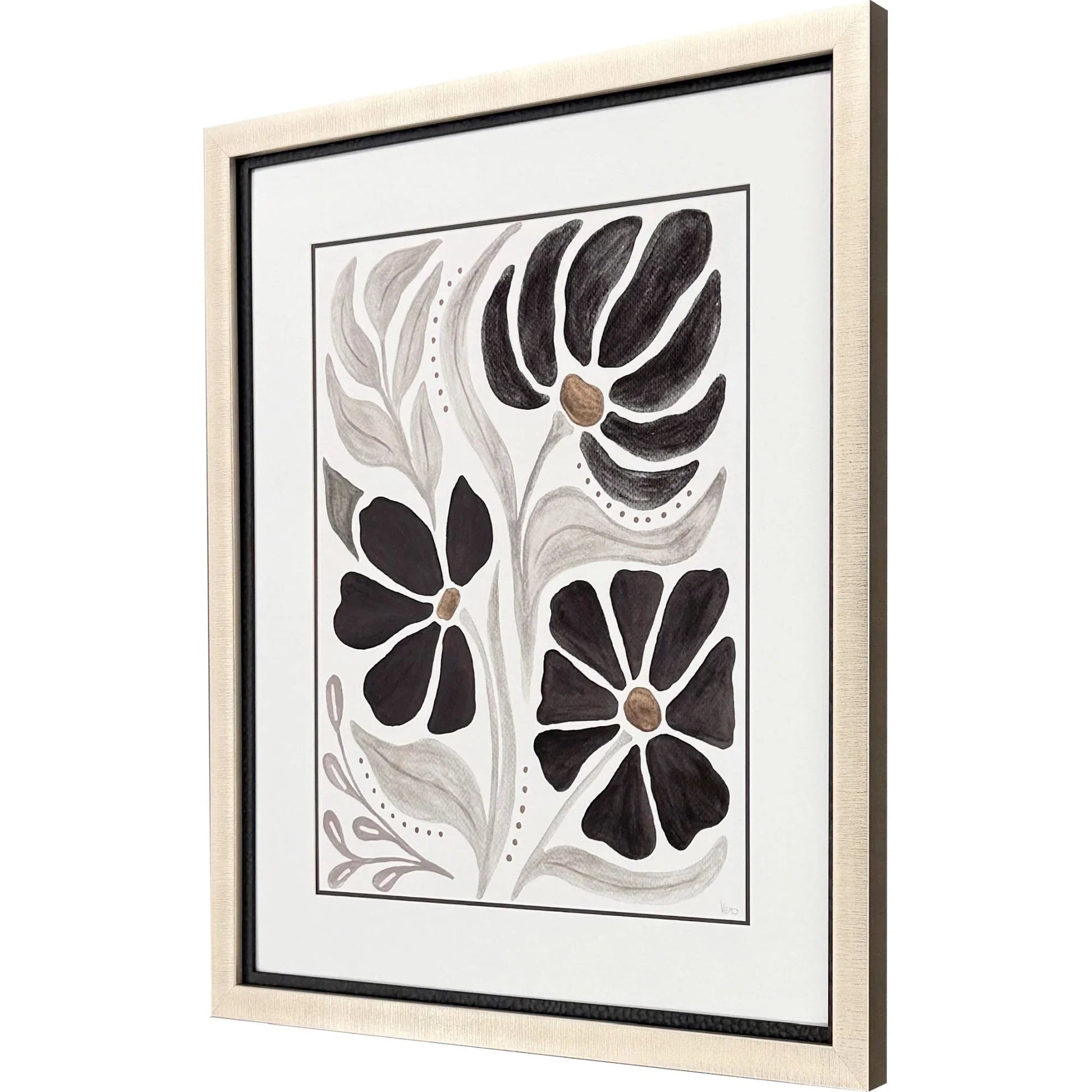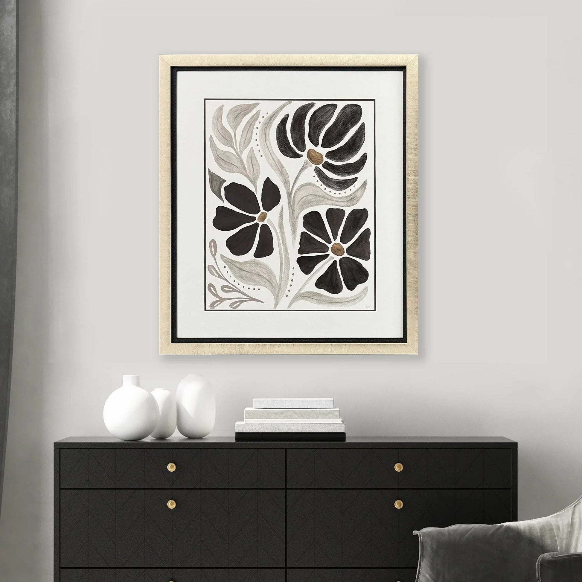 Transform your living space with the captivating Modern Petals II Giclee Art. This piece brings a touch of nature indoors with its abstract floral design, featuring black and gray flowers accented by beige tones. Encased in a double stacked frame, it combines contemporary style with elegance. The matte black wood surround and champagne gold block moulding add sophistication, making it a versatile addition to any room. Whether placed in a living room, bedroom, or office, this artwork enhances the ambiance with its calming visuals.