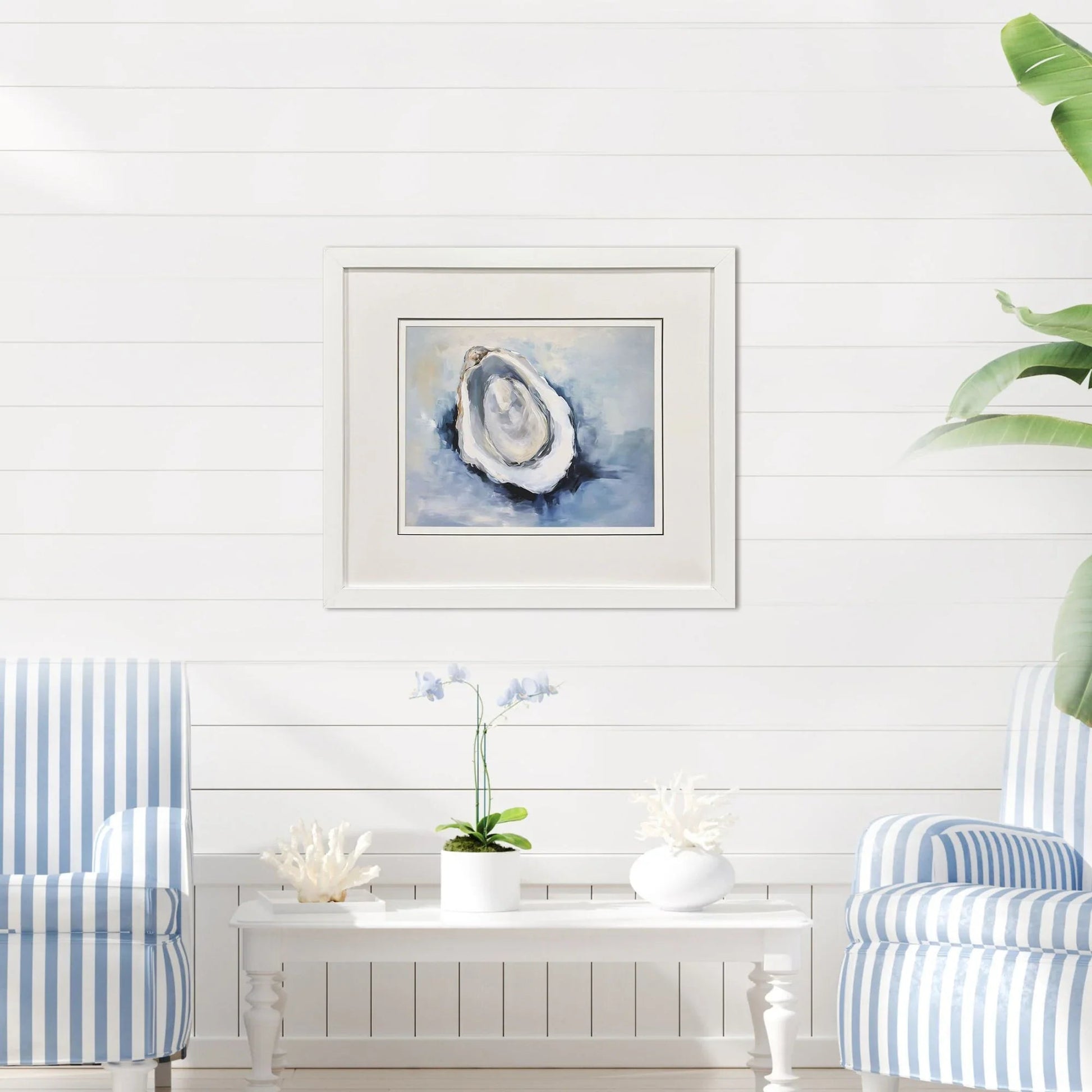 This coastal art piece brings the serene beauty of the ocean to any room. Featuring a detailed mollusk shell print, the artwork is elegantly triple-matted in white, navy blue, and white, creating a striking visual contrast. The shell's abstract design in white, blue, and gray shades adds a modern touch, making it a versatile piece for various decor styles. Its block profile frame with a matte white finish seamlessly blends with both contemporary and classic interiors. The rectangular shape of the piece offers a balanced and refined appearance that's sure to captivate viewers.