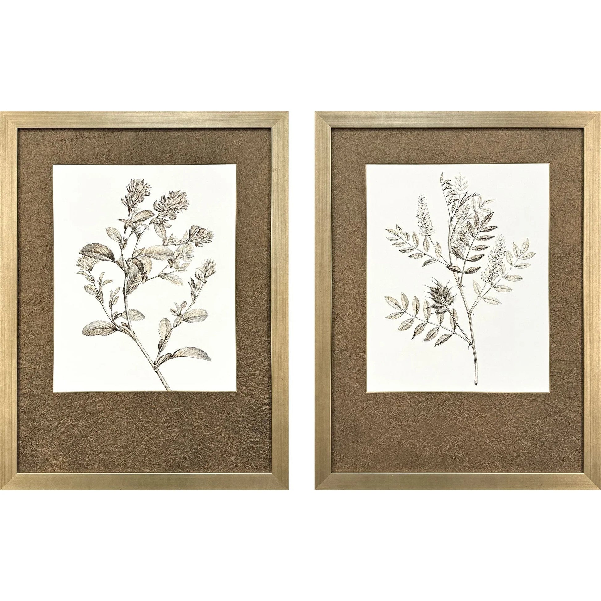 Enhance your wall decor with this elegant set of two botanical prints. Each piece features offset matting with hand-applied decorative papers and gold bevels, adding a touch of sophistication to any room. The prints are framed in antique silver leaf wood with a champagne wash, offering a classic and timeless look. The giclee printing technique ensures high-quality details and vibrant colors, making these artworks stand out in any space.