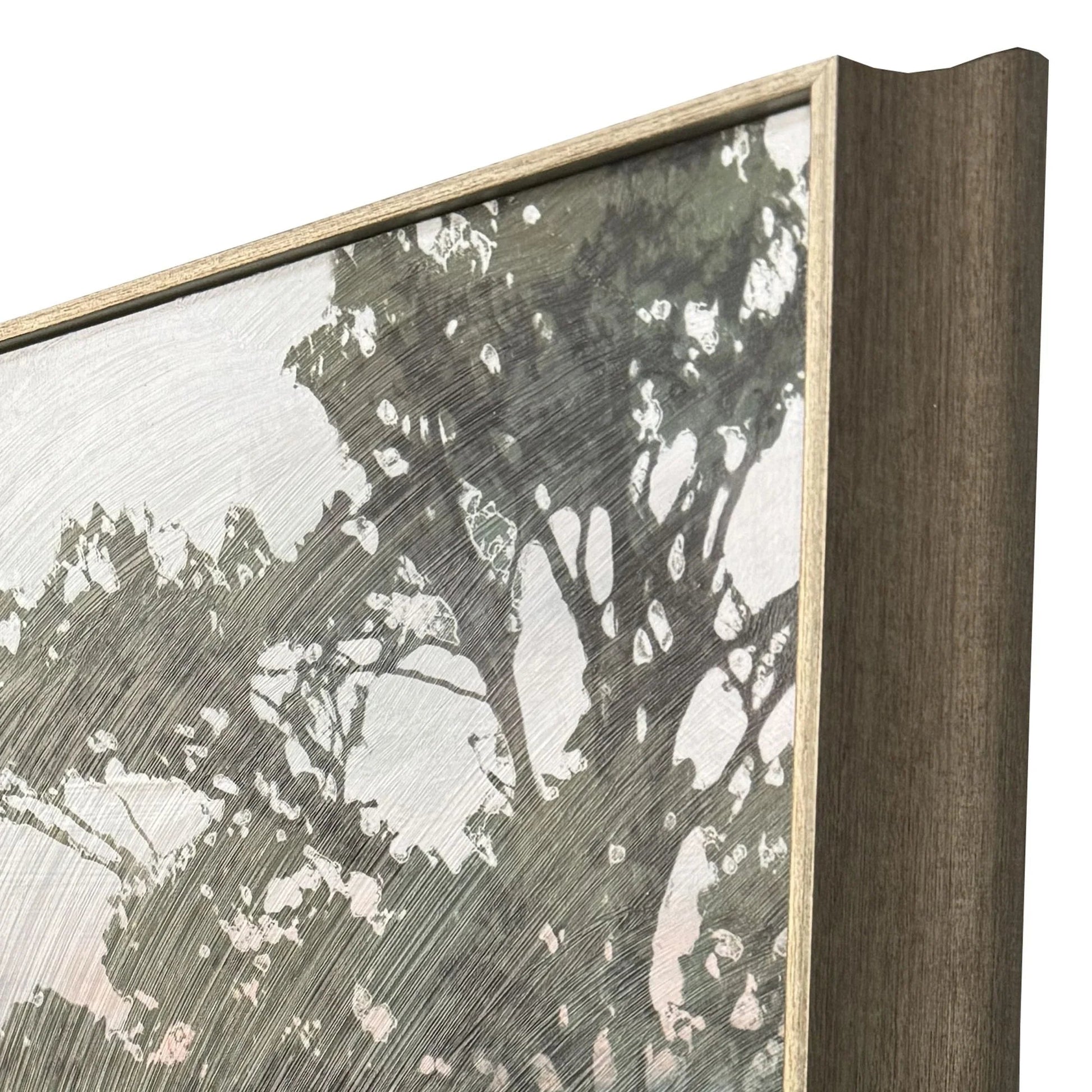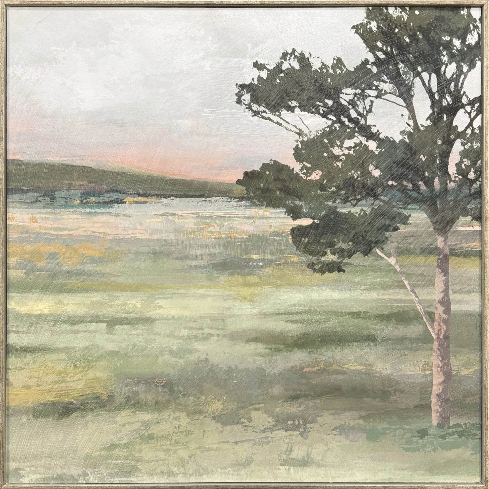 Bring the tranquility of nature into your space with this beautiful piece of artwork. The Noorong Hand Finished Dimensional Framed Artwork features a serene landscape, captured with a hand-applied enhanced gel finish. The soft green and beige tones create a calming atmosphere, making it a perfect addition to any room. With abstract brushstrokes, this piece offers a unique perspective on a quiet outdoor scene, showcasing the silhouette of trees against a pastel sky.