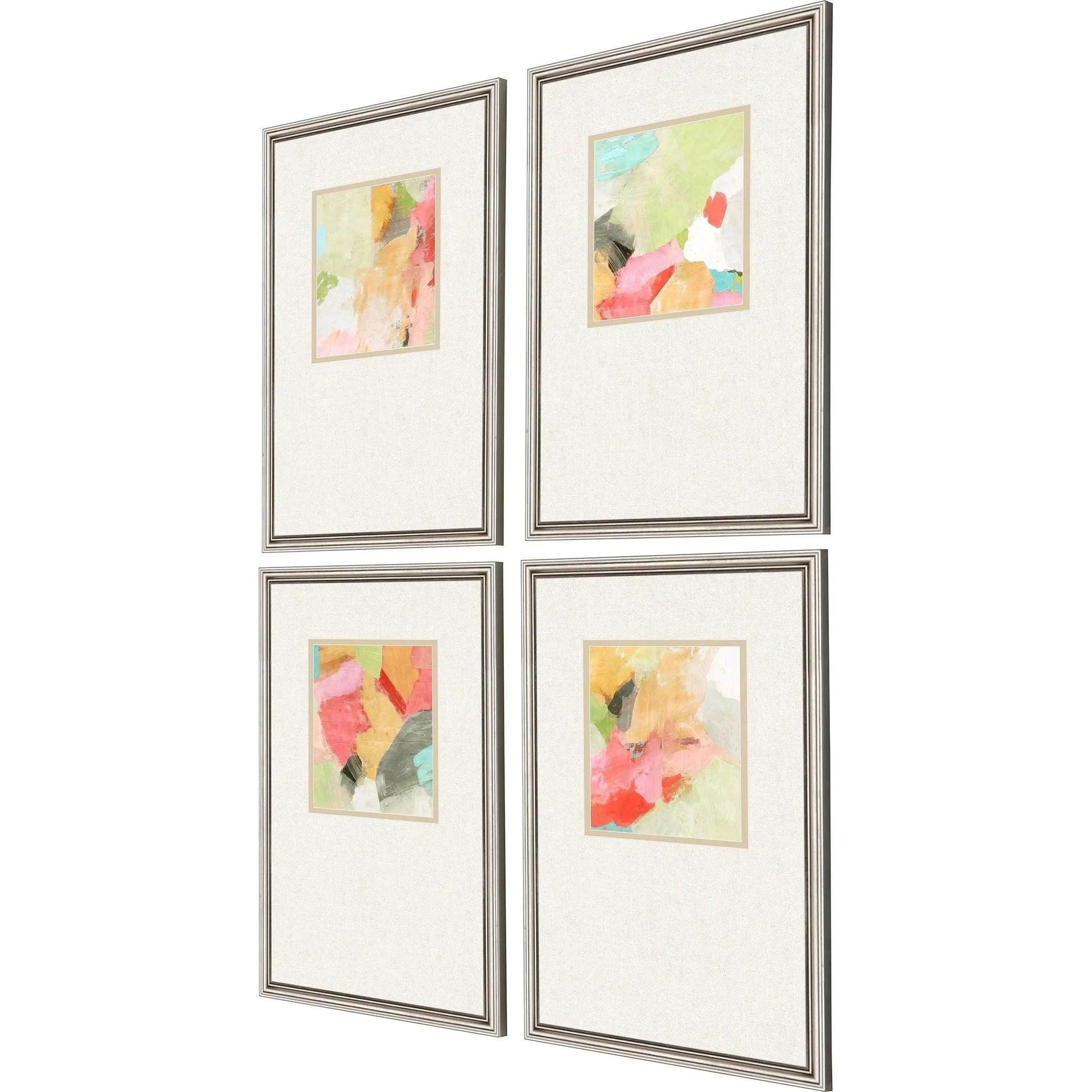 Enhance your living space with the Pastel Splash S/4 Contemporary Art Set. This exquisite collection of four art pieces brings a touch of elegance and modernity to any room. Each piece is a vibrant display of abstract art, featuring a stunning mix of colors including pink, orange, green, yellow, red, blue, black, and white. The unique combination of hues creates a visual symphony that draws the eye and sparks conversation. With its premium off-set matting and classic silver wood frames, this set is designed to impress and elevate your home's ambiance.