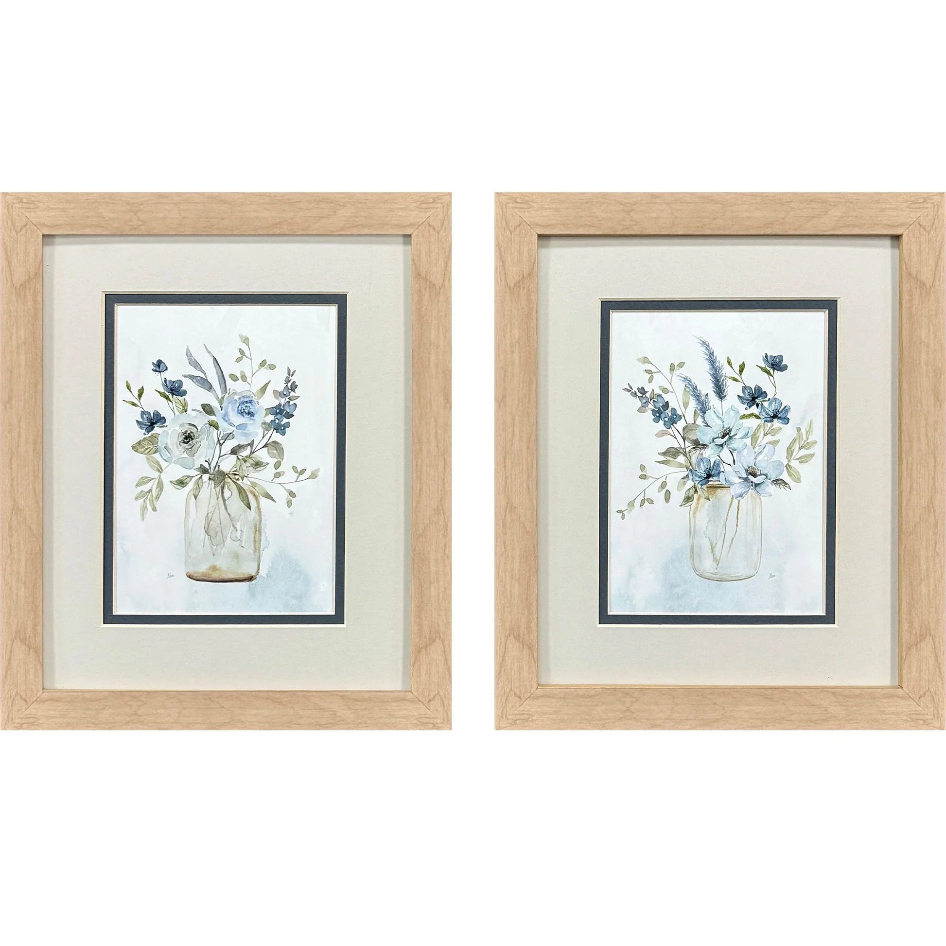 Enhance your living space with a touch of elegance through this exquisite set of two floral artworks. The "Petite & Sweet S/2 Floral Art With Glass Front" features delicate blue floral bouquet prints that bring a sense of tranquility and charm to any room. Each piece is double matted, accentuating the artwork with a neutral top mat and a blue inner mat that perfectly complements the floral design. Framed in sleek natural wood, these pieces boast a traditional style that seamlessly blends with both classic and contemporary décor.