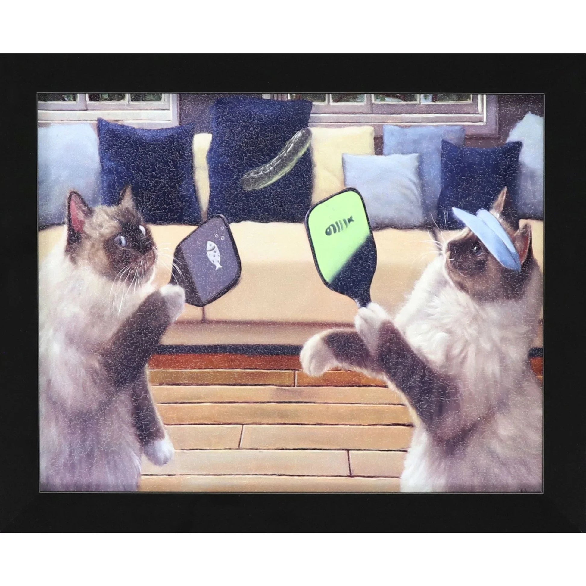 Add a playful touch to your space with this framed art piece that brings humor and charm to any room. The artwork features two quirky cats engaged in a delightful game, complete with paddles and feathered fun. Their colorful visors add a splash of whimsy, set against a cozy background of a beige couch with vibrant blue and yellow cushions. The vibrant red color of the print effortlessly brightens up any wall, making it a delightful conversation starter.