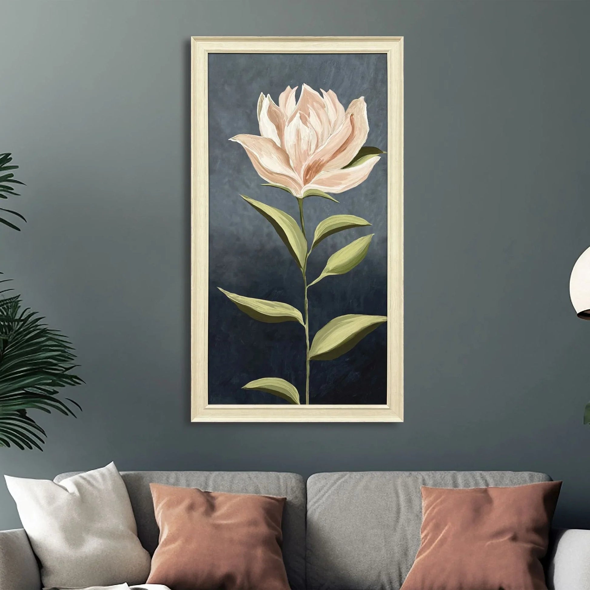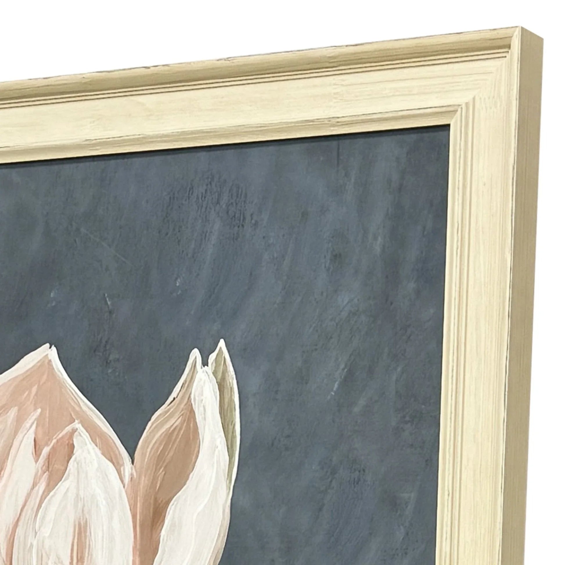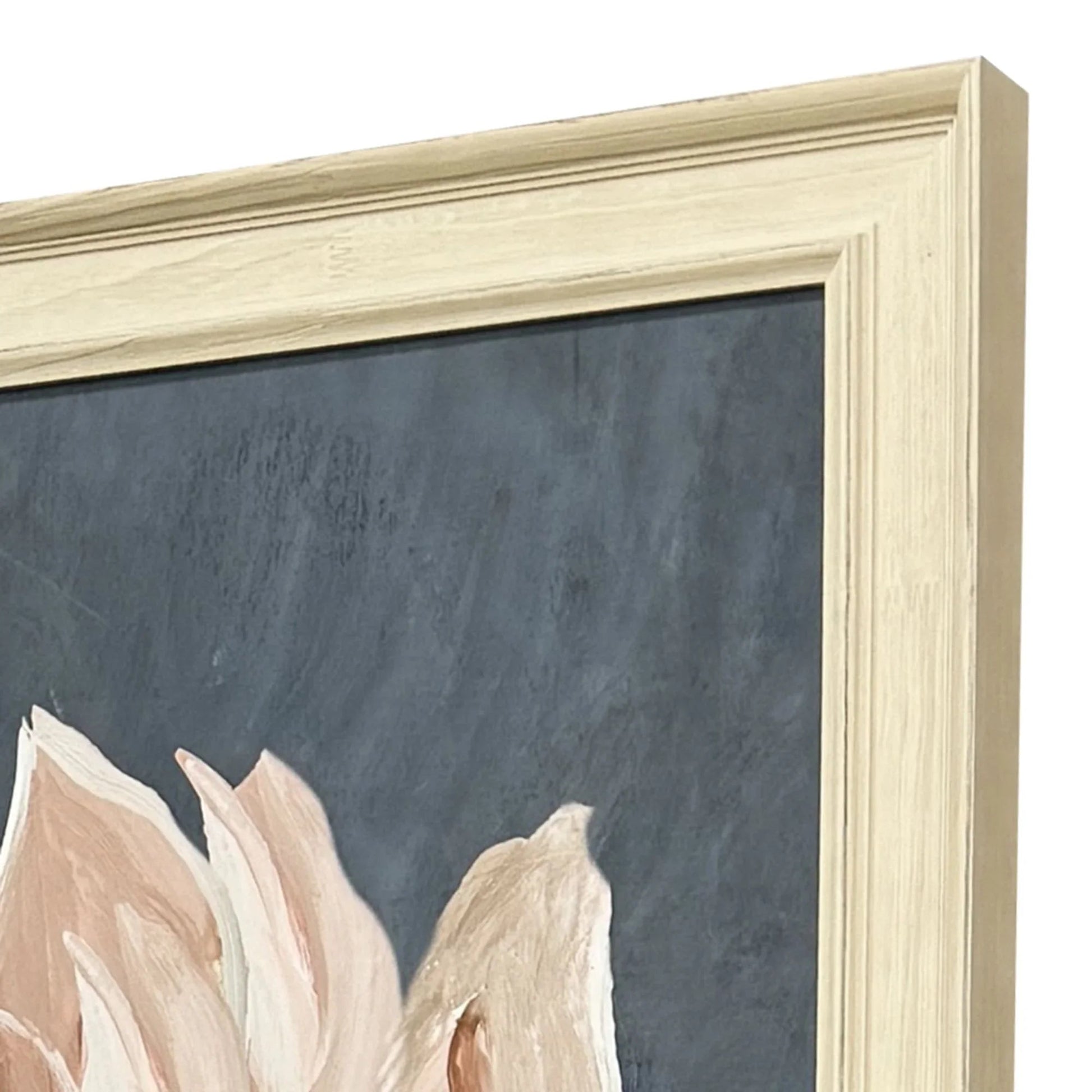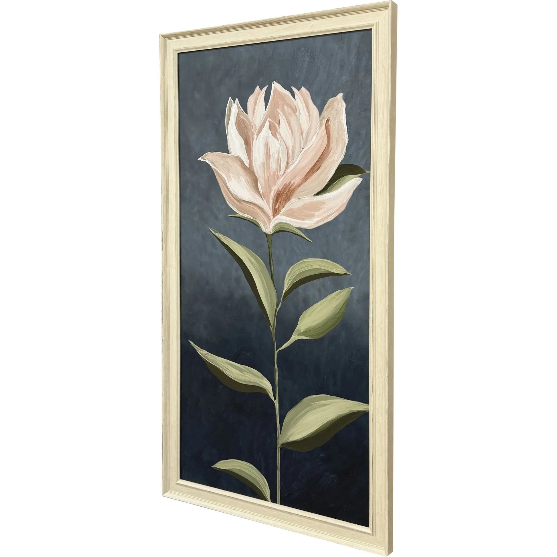 Bring elegance into any room with this captivating framed artwork. Featuring a striking pink magnolia stem set against a dark, rich background, this piece draws attention with its bold yet graceful presence. The design is enhanced by the traditional scoop and panel frame in distressed ivory wood, complementing the transitional style that fits effortlessly within various decor themes. The use of giclee printing ensures the finest details of the flower and leaves are captured with stunning clarity and depth, making this a standout piece in any home or office.