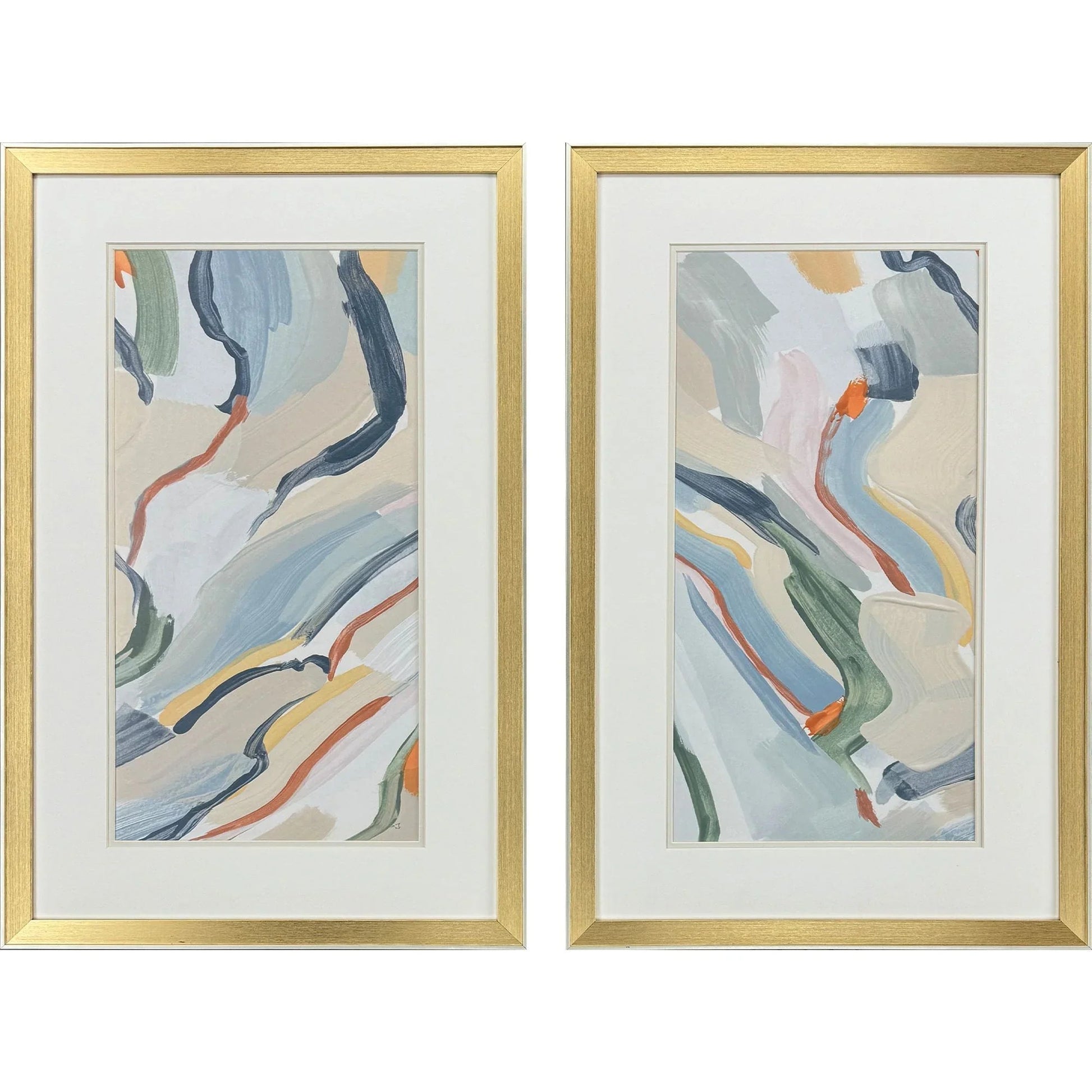 Enhance your living space with this stunning set of two abstract art pieces. The colorful brushstrokes in hues of blue, green, orange, beige, and white bring a lively and modern aesthetic to any room. The artwork is double matted in white and light buff, providing a clean and sophisticated look that complements contemporary décor. Each piece is framed in a modern gold-finish moulding with a champagne side and lip, adding a touch of elegance and luxury to your walls.