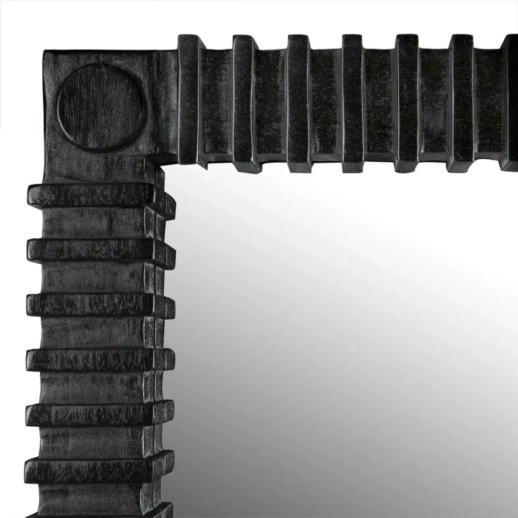 The Rift Mirror is a versatile and refined wall accent designed to enhance any room with its clean lines and striking presence. Crafted in two distinct versions—one from Mindi wood with a Charcoal Black finish and the other from premium teak with a Clear Coat Flat finish—this mirror offers options for bold contrast or warm natural tones. Both versions feature a rectangular shape, minimalist design, and are suitable for horizontal or vertical mounting, making them flexible for modern or classic interiors. The Mindi wood version emphasizes depth and a sleek contemporary statement, while the teak version showcases ribbed texture, interlocking corners, and organic grain patterns for added elegance.