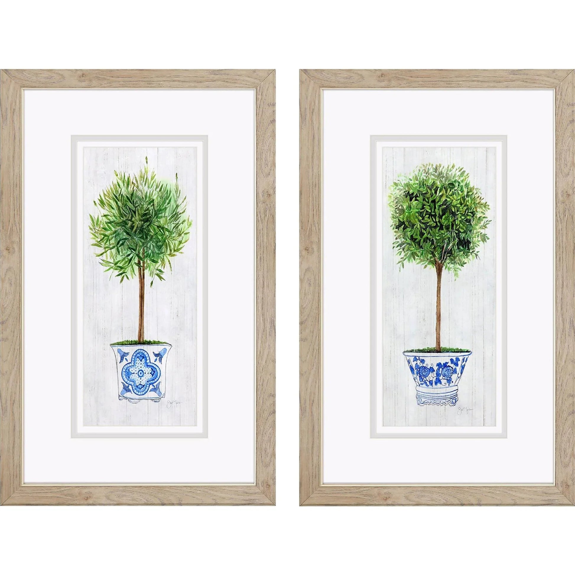 Enhance your living space with the charm of the Rosemary Thyme S/2 Elegant Topiaries. These pieces feature beautiful green tree topiary art, adding a natural touch to any room. The topiaries are set in striking blue and white decorative pots, offering a contrast that captures attention. The artwork is matted in white, providing a crisp, clean look that complements its casual style. This artwork is framed in a natural wood finish with a champagne gold lip, adding a hint of sophistication to your decor.
