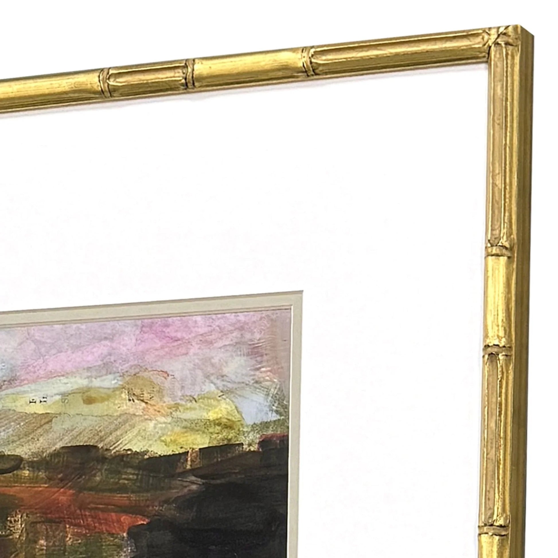 Transform your living space with this stunning set of contemporary art prints. Each piece features rich colors that elegantly blend pink, green, red, and black to create a series of abstract landscapes. The art is matted in white, providing a clean and modern look that enhances the vibrant colors. These prints are framed in an antique gold finish wood with a bamboo pattern embossing, adding a touch of sophistication and elegance to any room. Designed to complement a variety of home décor styles, this set of four is perfect for creating a cohesive and stylish look in your home.