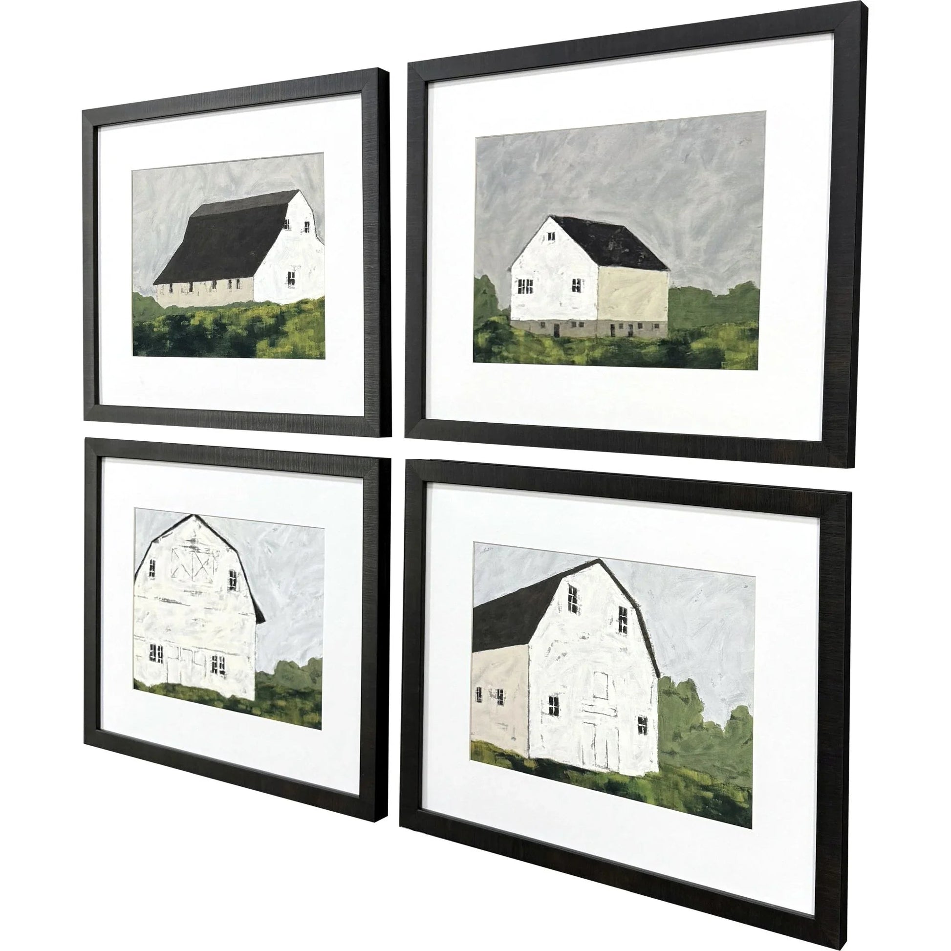 Bring a touch of the countryside into your home with this charming set of four framed artworks. Each piece features nostalgic farm structures set against a lush green landscape, capturing the serene beauty of rural life. The images are matted in white, creating a clean contrast that enhances the vibrant colors of the artwork. The dark espresso wood finish of the frames adds a touch of elegance, making these pieces suitable for any casual or rustic décor.