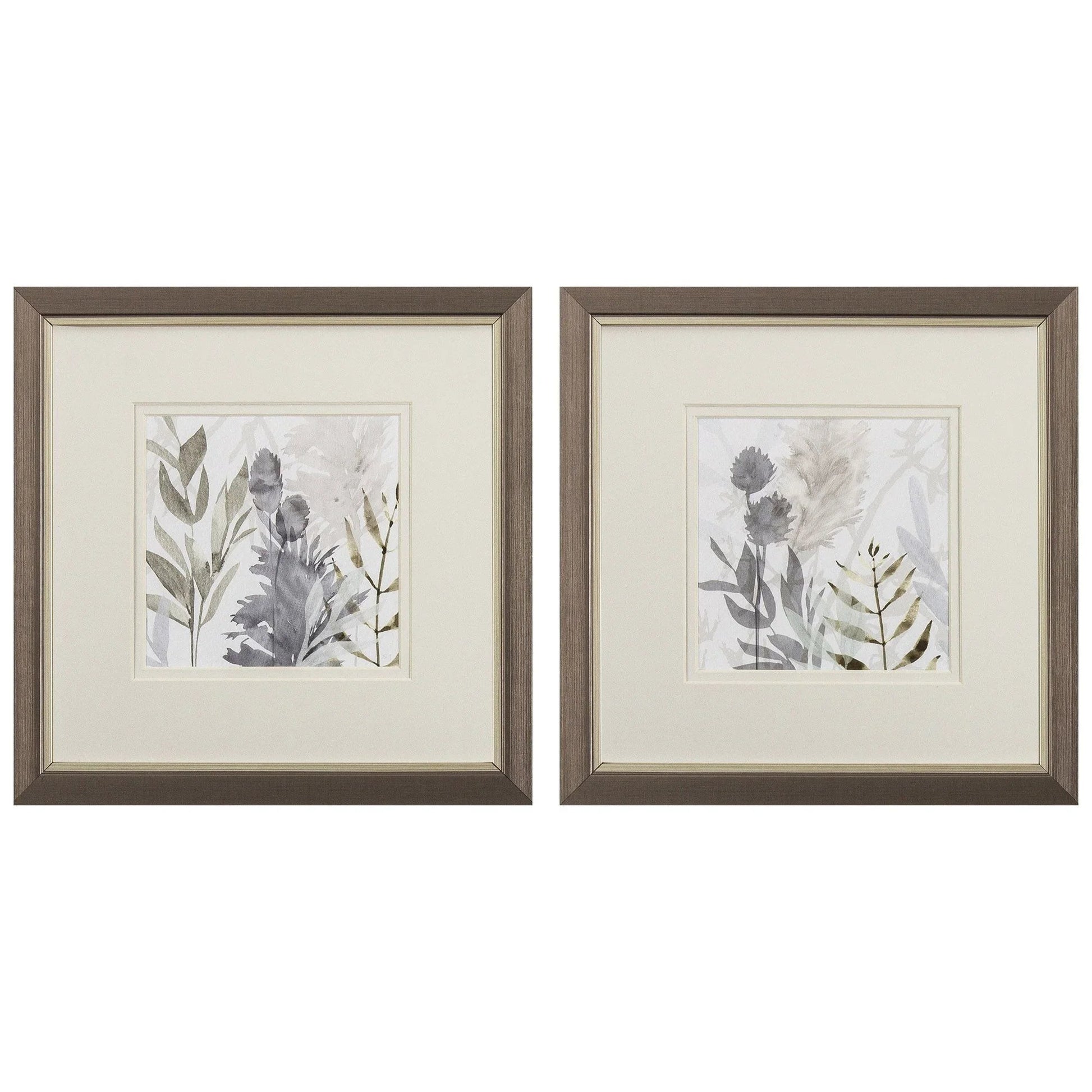 Enhance your living space with the timeless elegance of a set of two framed floral prints. These pieces showcase a sophisticated botanical design, featuring soft neutral tones such as beige, gray, and green. Each print is elegantly displayed within a metallic bronze frame, adding a touch of class to any room. The double matting enhances the artwork, creating a refined look that suits a variety of décor styles, especially casual settings.