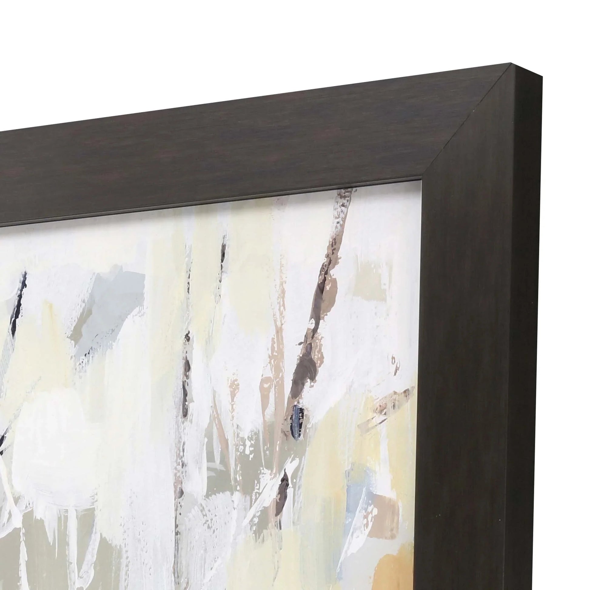 Bring a touch of nature into your home with this captivating piece of art that beautifully captures the serene essence of a birch wood forest. The Silversong Birch I and II Framed Art With Glass Front is a stunning addition to any space, featuring a modern representation of trees with bare branches. The artwork's palette of gray, beige, white, black, and light blue creates a calming atmosphere, making it a perfect centerpiece for any room. Encased in a dark wood finish block profile moulding, the frame adds an elegant touch, perfectly complementing the transitional style of the piece.