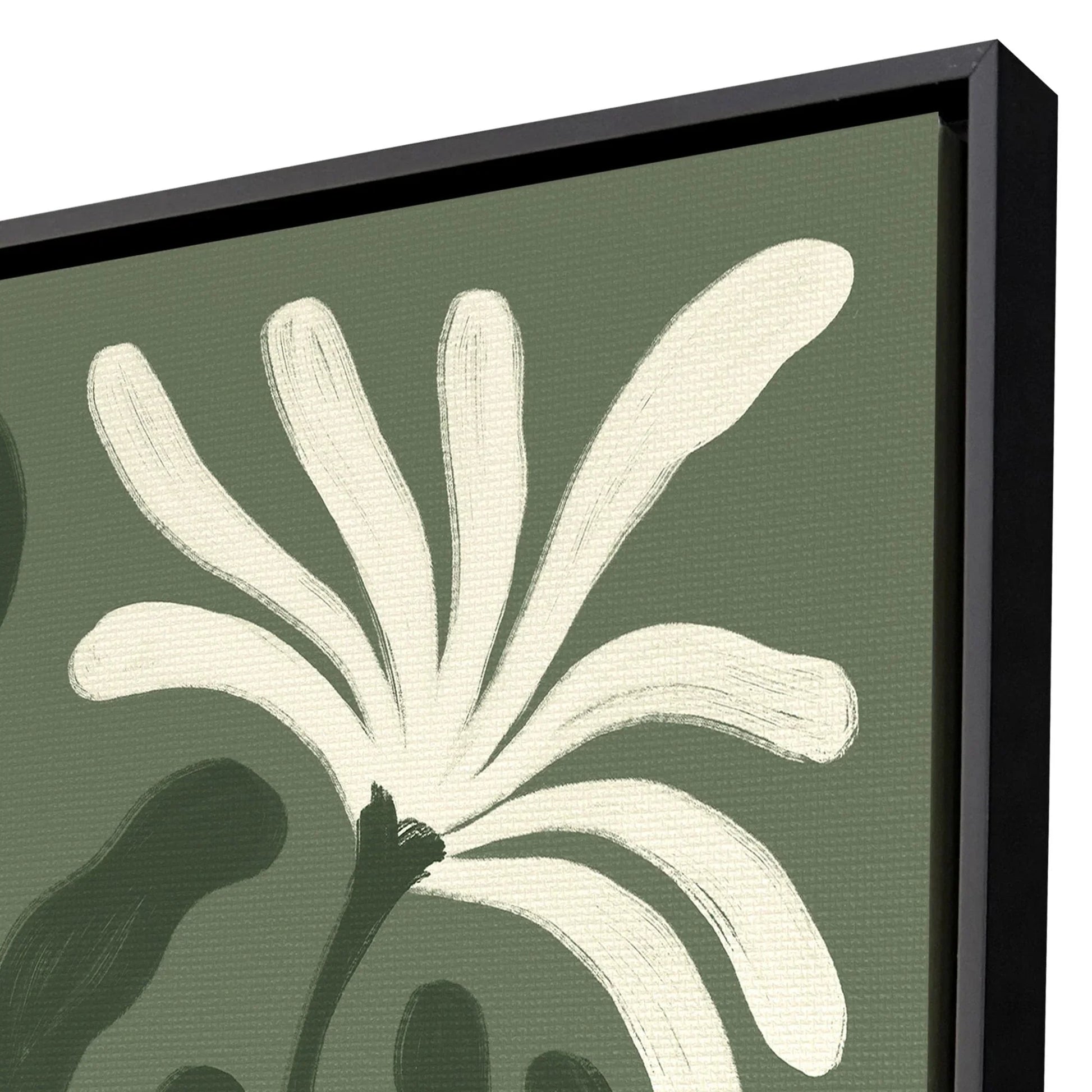 This piece features dark green leaves and white petals set against an olive green background, creating a striking contrast that draws the eye. Its abstract style offers a fresh take on traditional floral art, making it a great choice for those looking to add a unique touch to their walls. The frame is crafted without glass, allowing the texture of the canvas to be appreciated up close. Hand-assembled with care, this art piece is both durable and lightweight, making it easy to hang.