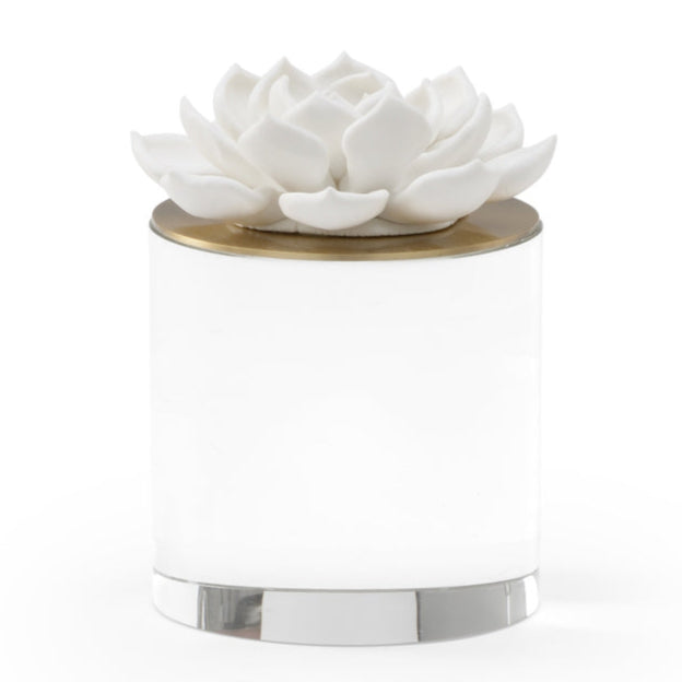 Add a touch of elegance to any space with this handmade succulent sculpture, crafted by Claire Bell. This piece features a white lotus-shaped ceramic ornament atop a clear crystal base, giving it a sophisticated yet modern look. The glossy finish adds a touch of luxury, while the gold-accented lid provides a hint of warmth and richness. Perfect for home or office, this sculpture brings a sense of calm and beauty to your environment. The compact size makes it versatile for any tabletop or shelf, making it an easy fit for any decor style. Enhance your space effortlessly with this unique art piece.