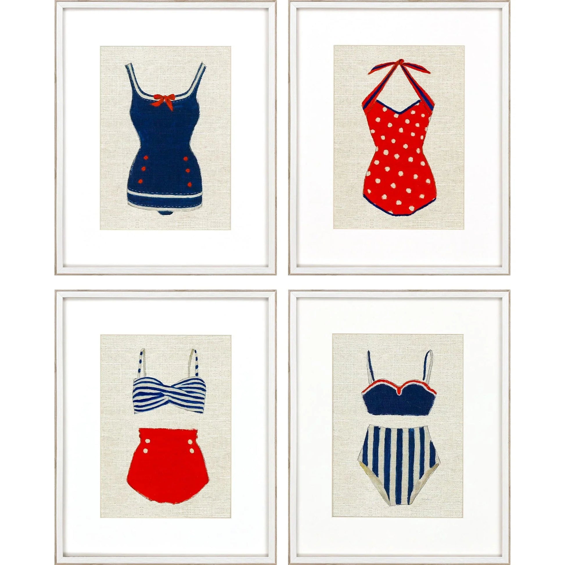 Step into a world of coastal charm with these vintage swimsuit art pieces that capture the essence of sunny days by the beach. Each of the four prints showcases a unique retro swimsuit design, featuring delightful patterns such as blue with red accents, red polka dots, blue stripes, and red with blue stripes. These prints are elegantly set against a beige background, enhancing their nostalgic appeal. The white matting adds a touch of sophistication, while the rustic whitewash frame ties everything together beautifully, making it a perfect addition to any room with a coastal or vintage theme.