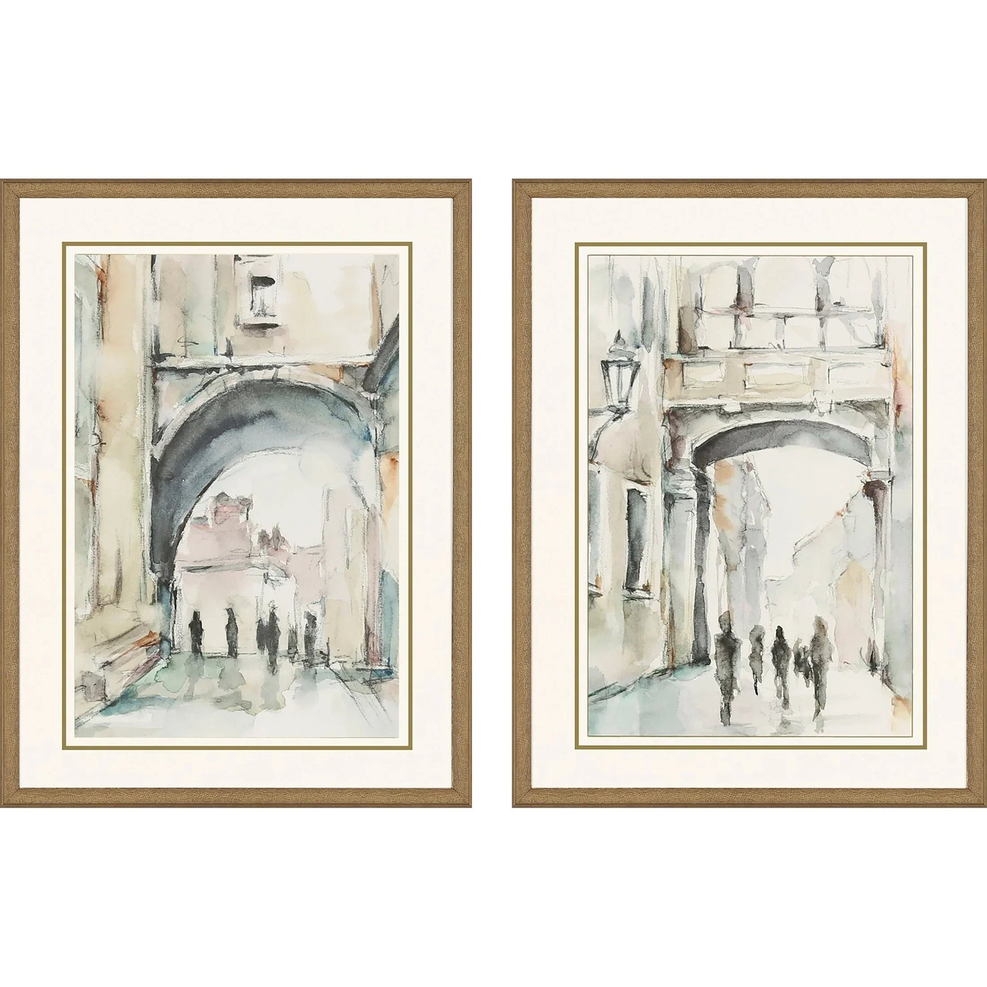 The Watercolor Arches I and II S/2 Hand Finished Art Set adds a touch of elegance to any room with its soft watercolor street scenes. Each piece in this two-piece set captures a cityscape with intricate arches and figures, rendered in calming hues of beige, gray, blue, and brown. Hand-applied gold lines add a subtle shimmer to the artwork, enhancing the overall aesthetic. Framed in a sophisticated antique gold wood with an embossed weave pattern, these pieces embody a transitional style that complements a variety of interior decors.